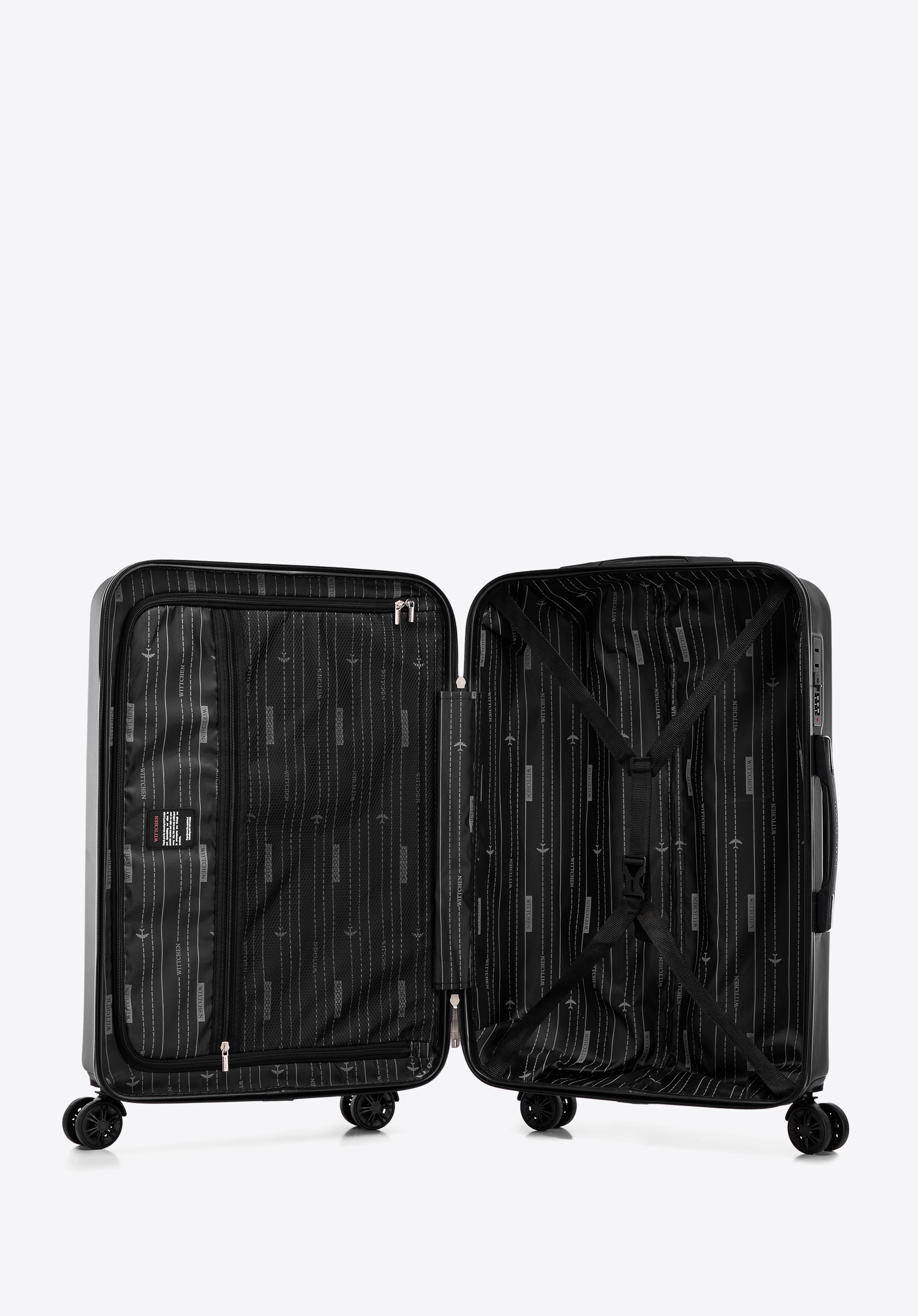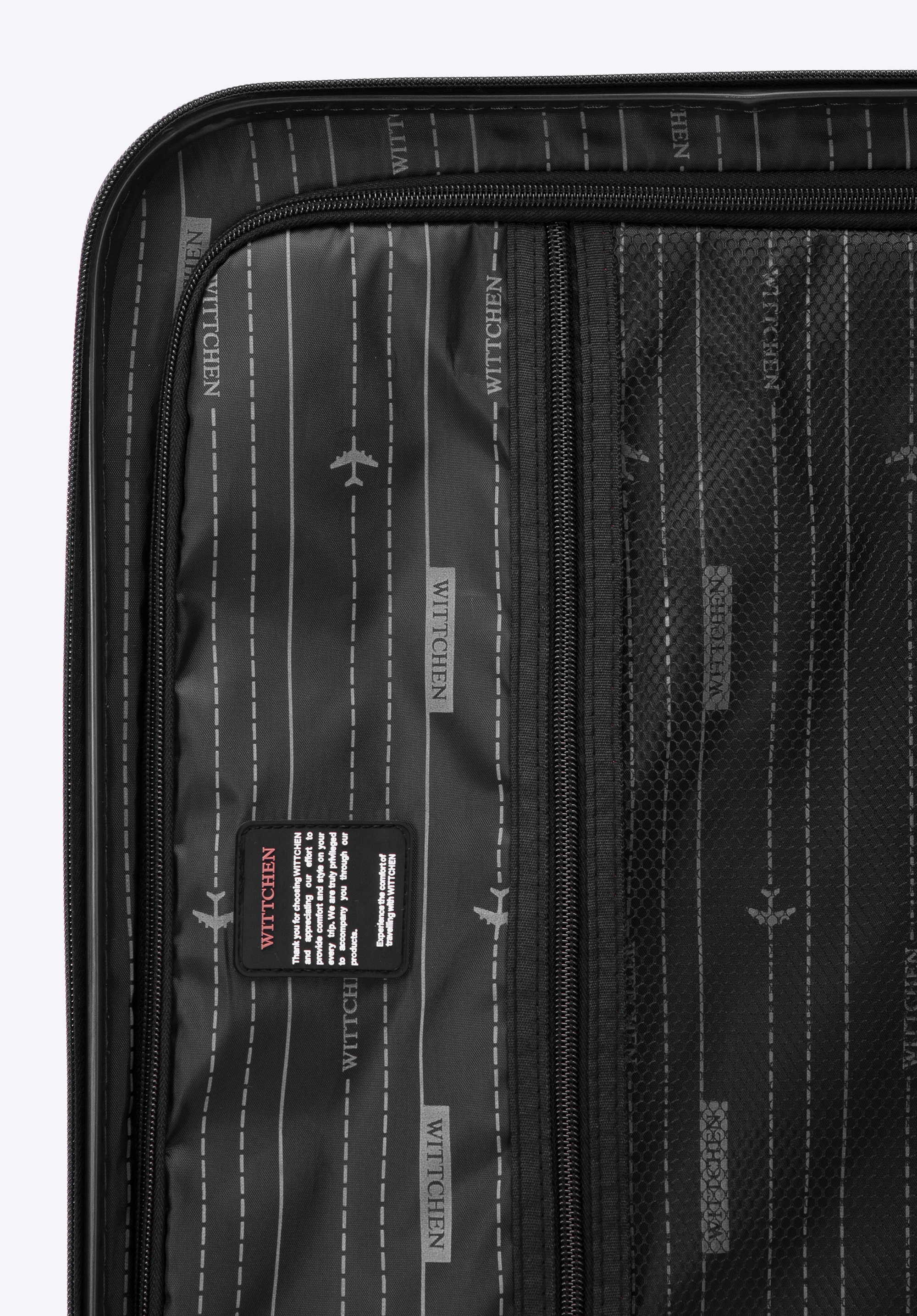 - Interiorul valizei: Fiecare valiză are bretele reglabile, un buzunar și un compartiment cu fermoar.