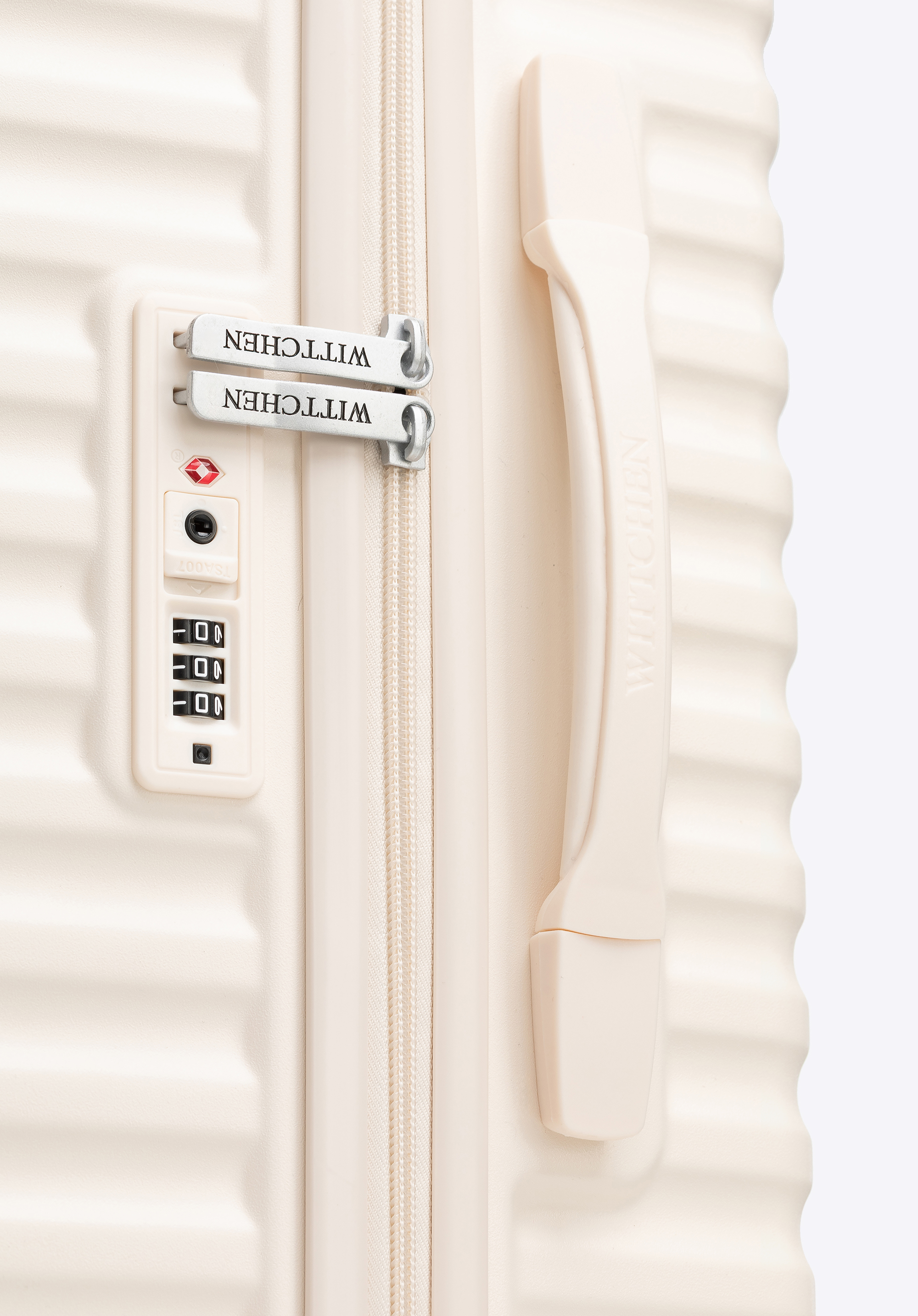 - Stabilitate: Patru știfturi laterale de pe valizele medii și mari mențin bagajul în poziție verticală și stabil atunci când este așezat pe o parte.