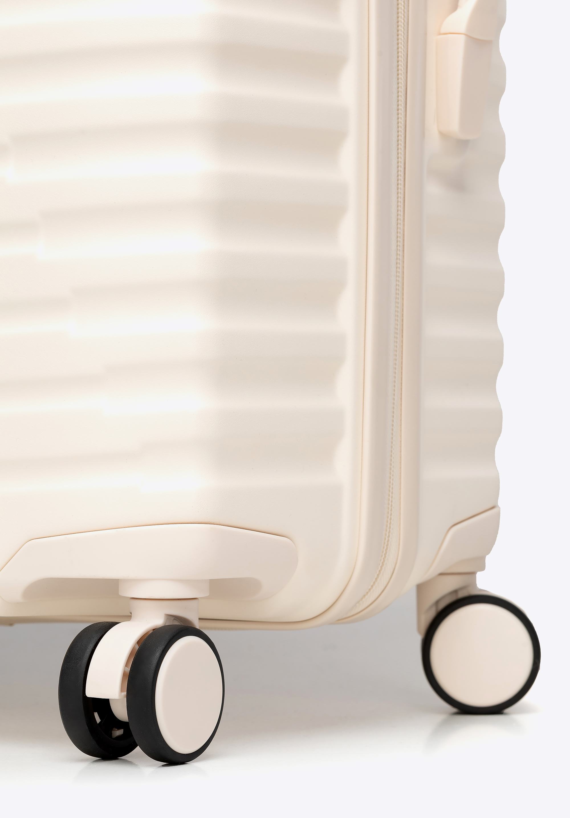 - Mobilitate: Toate valizele sunt echipate cu 4 roți duble pivotante care oferă o rotație de 360° pentru o manevrare lină în orice direcție.