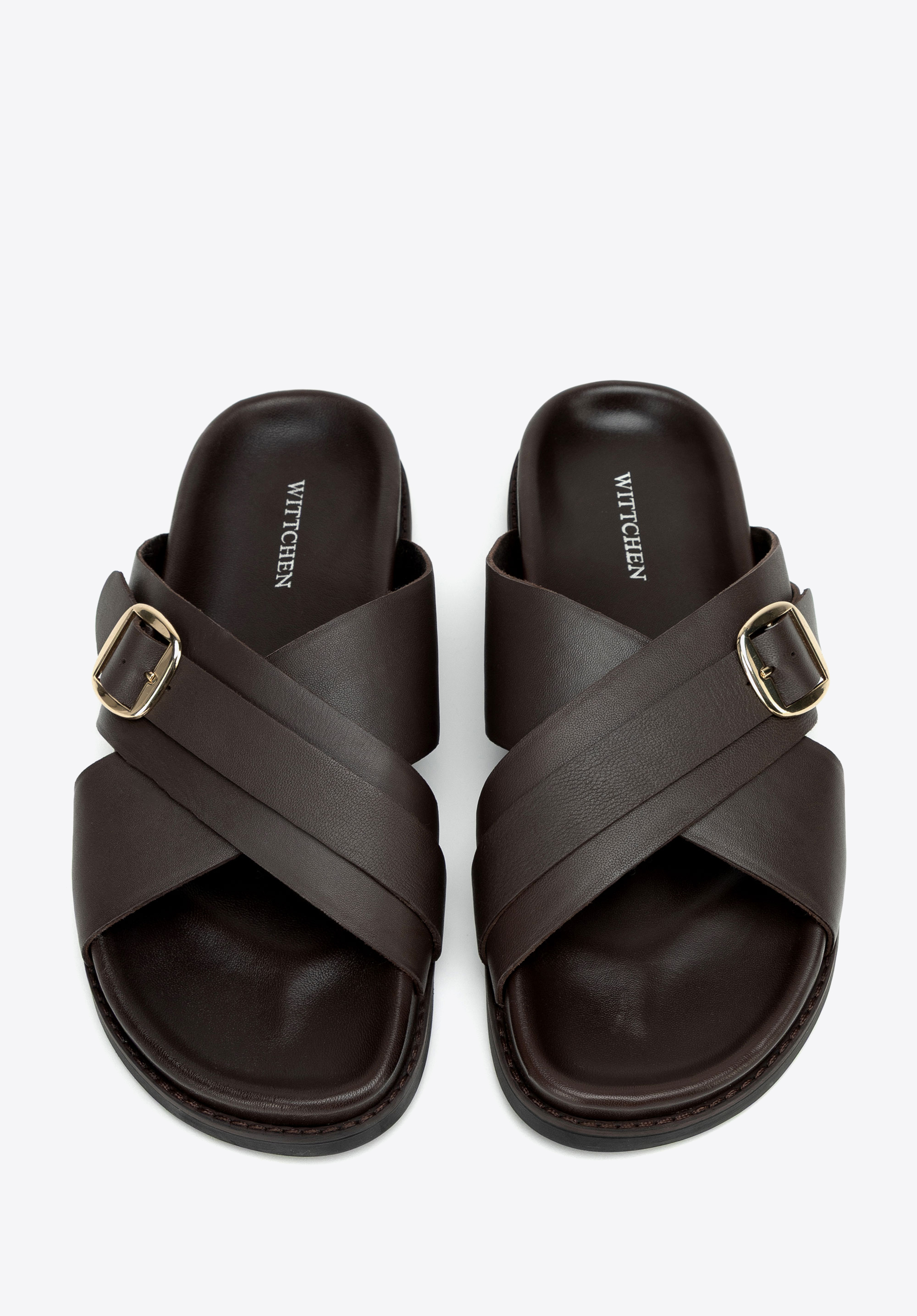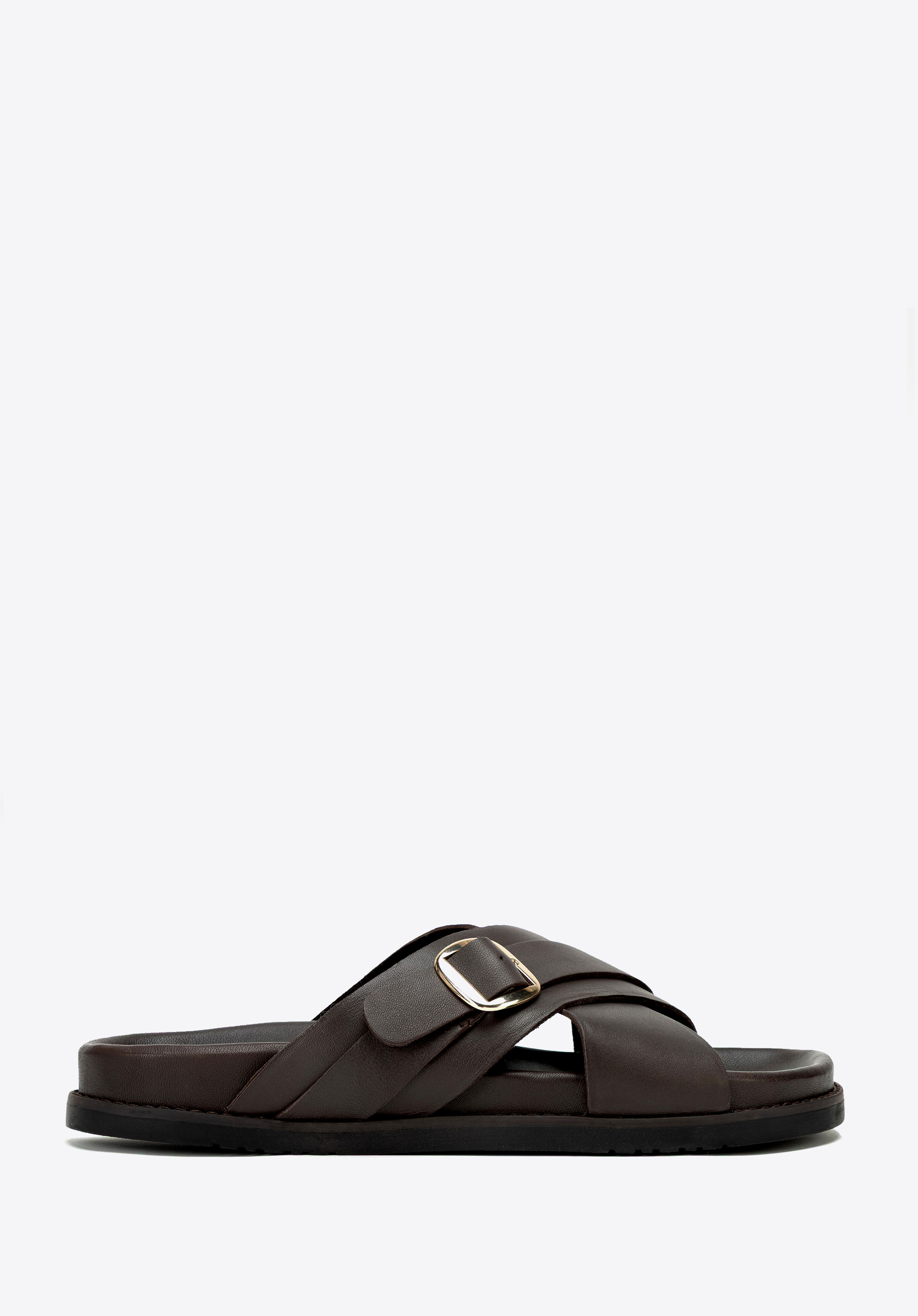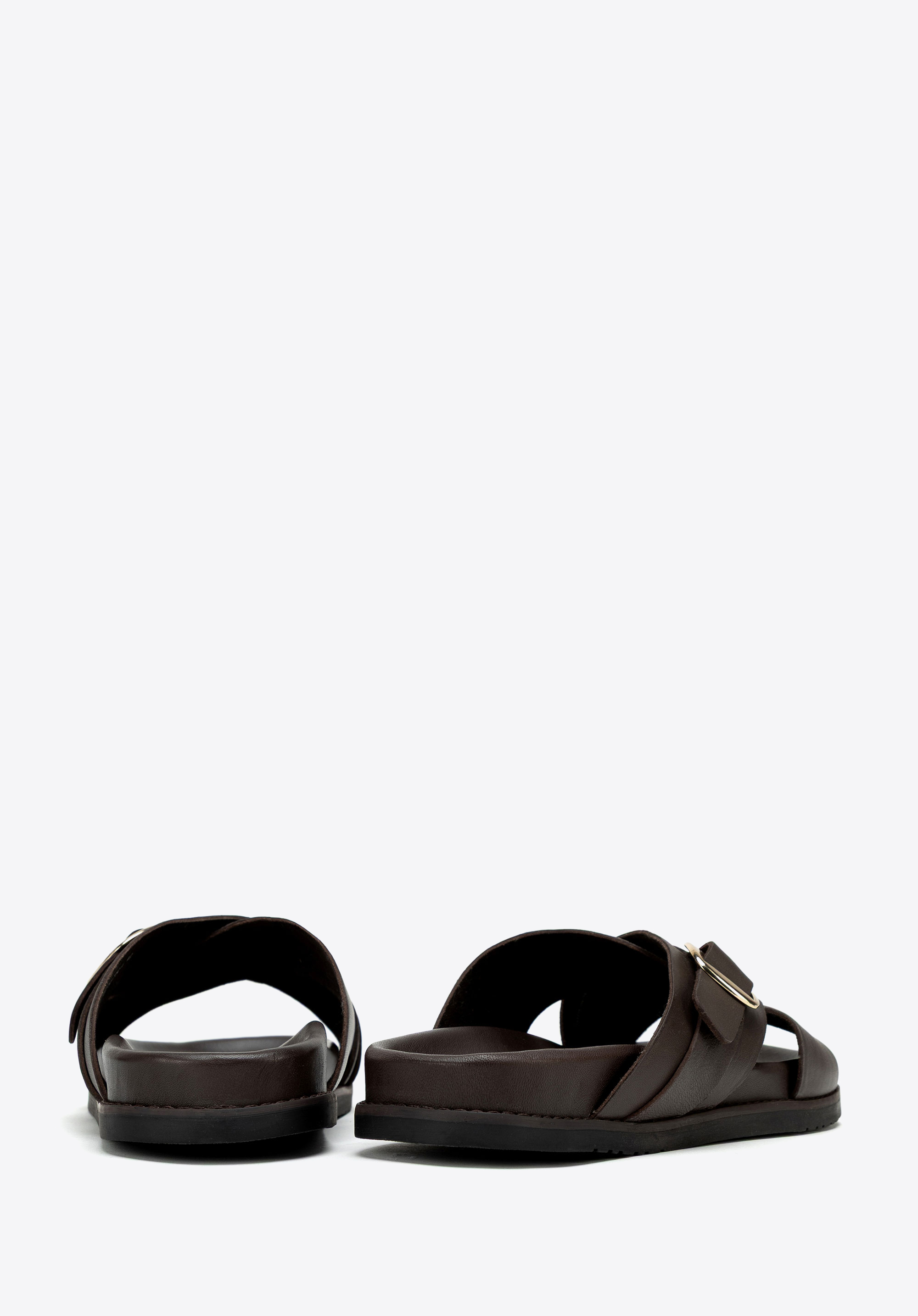 Șlapi bărbătești din piele, cu barete încrucișate și cataramă