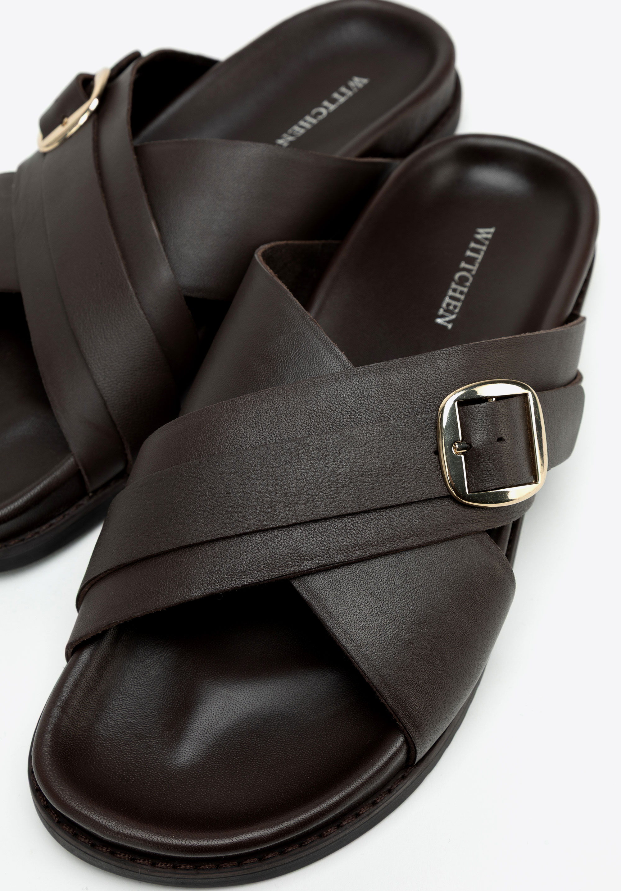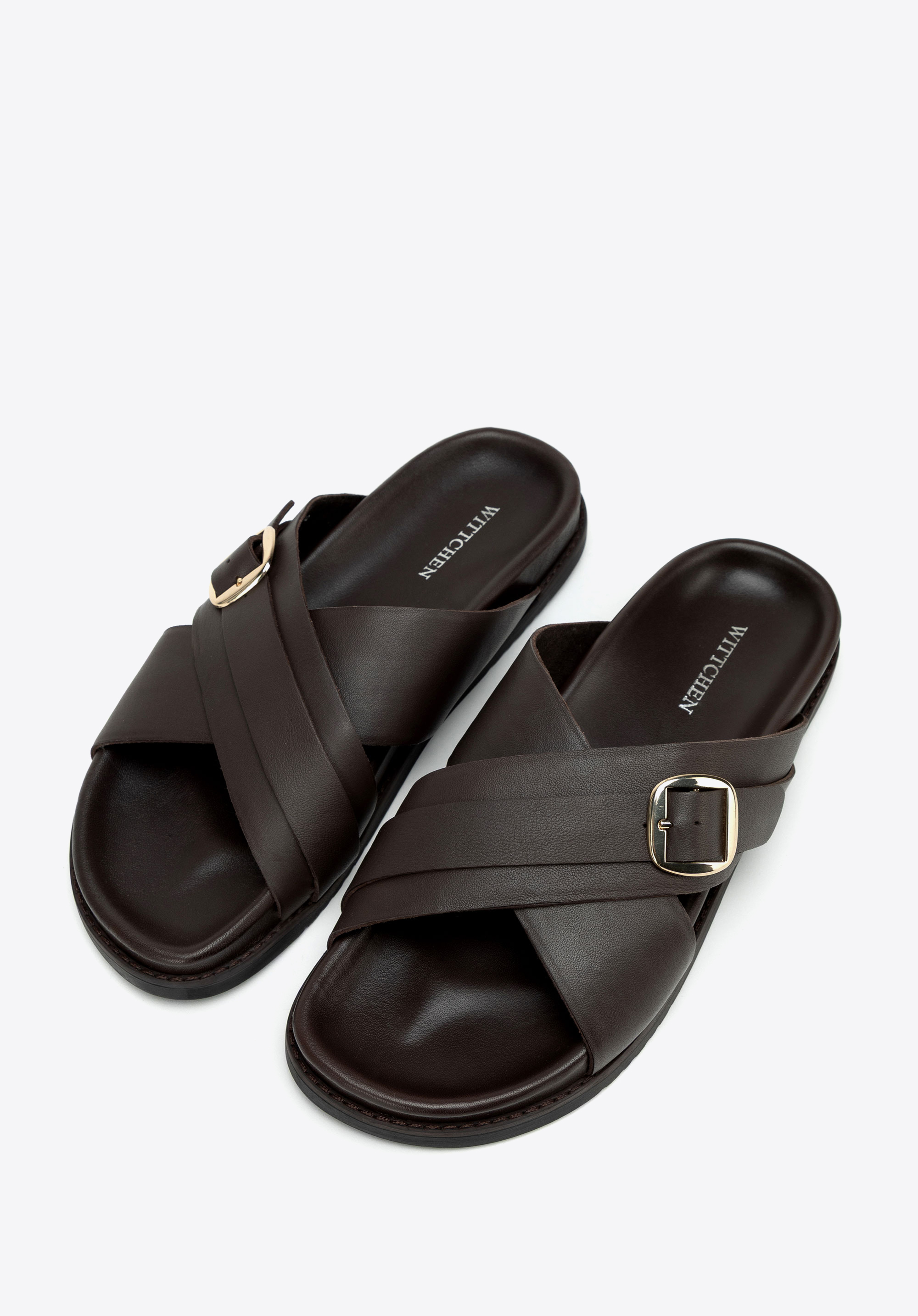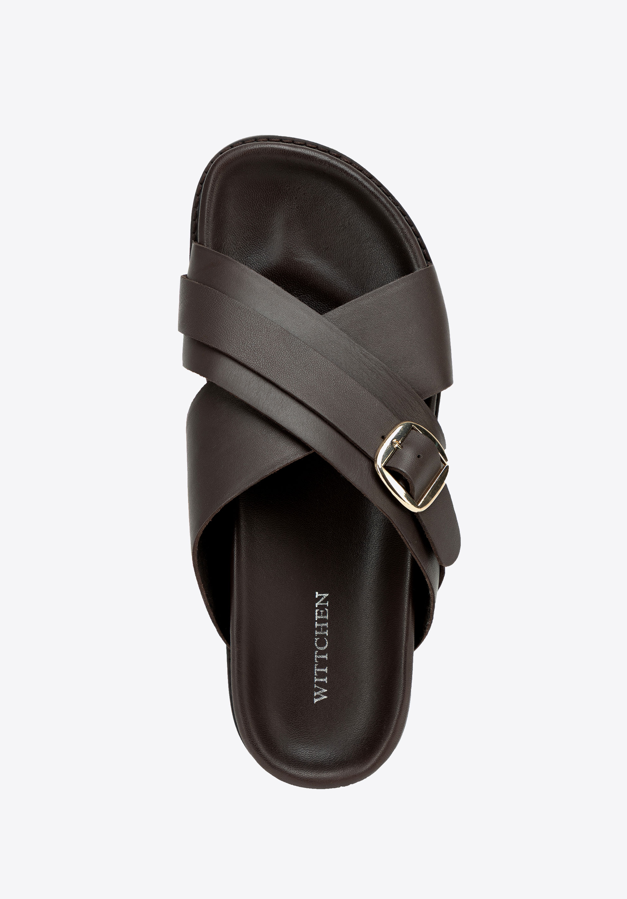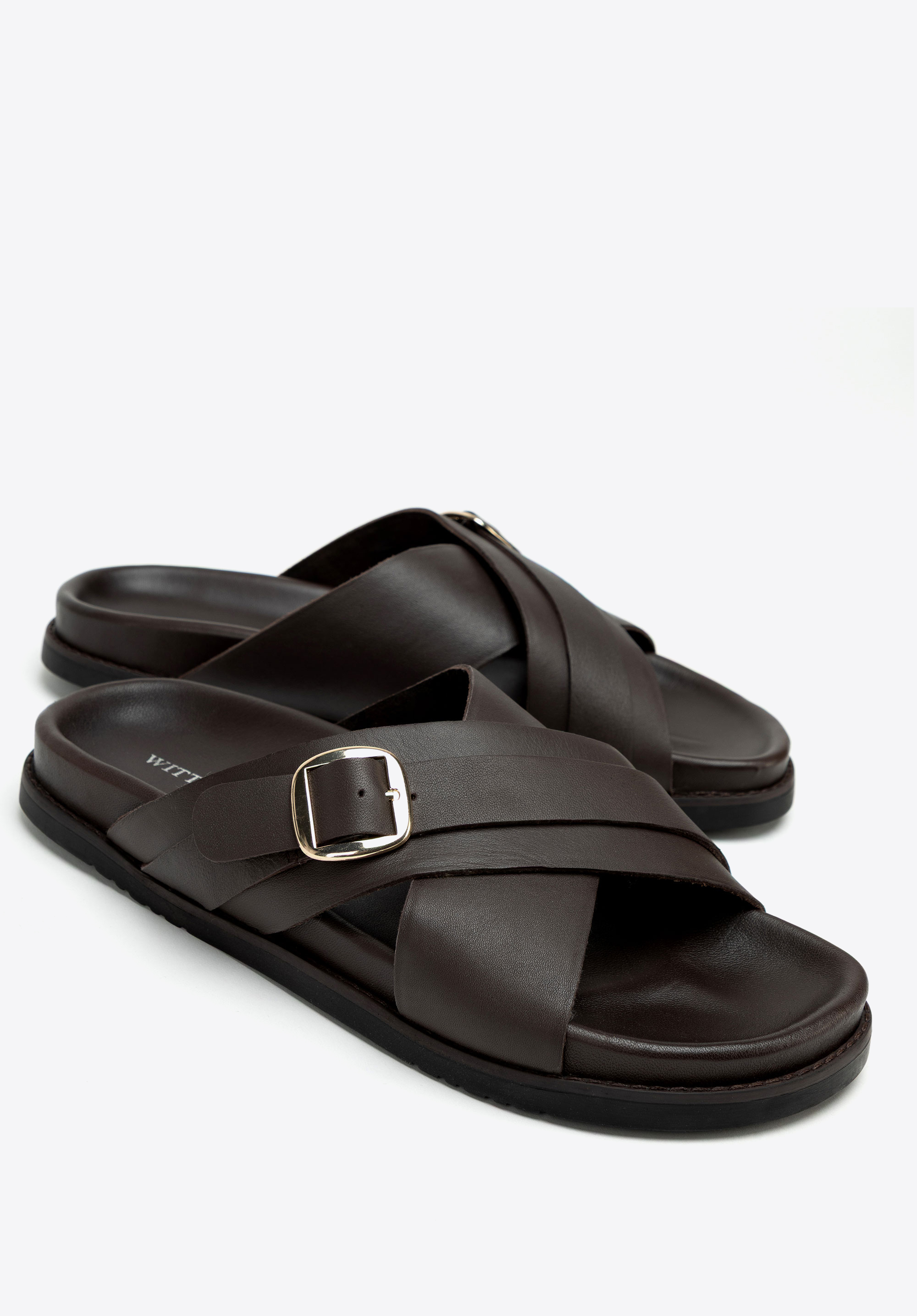 Șlapi bărbătești din piele, cu barete încrucișate și cataramă
