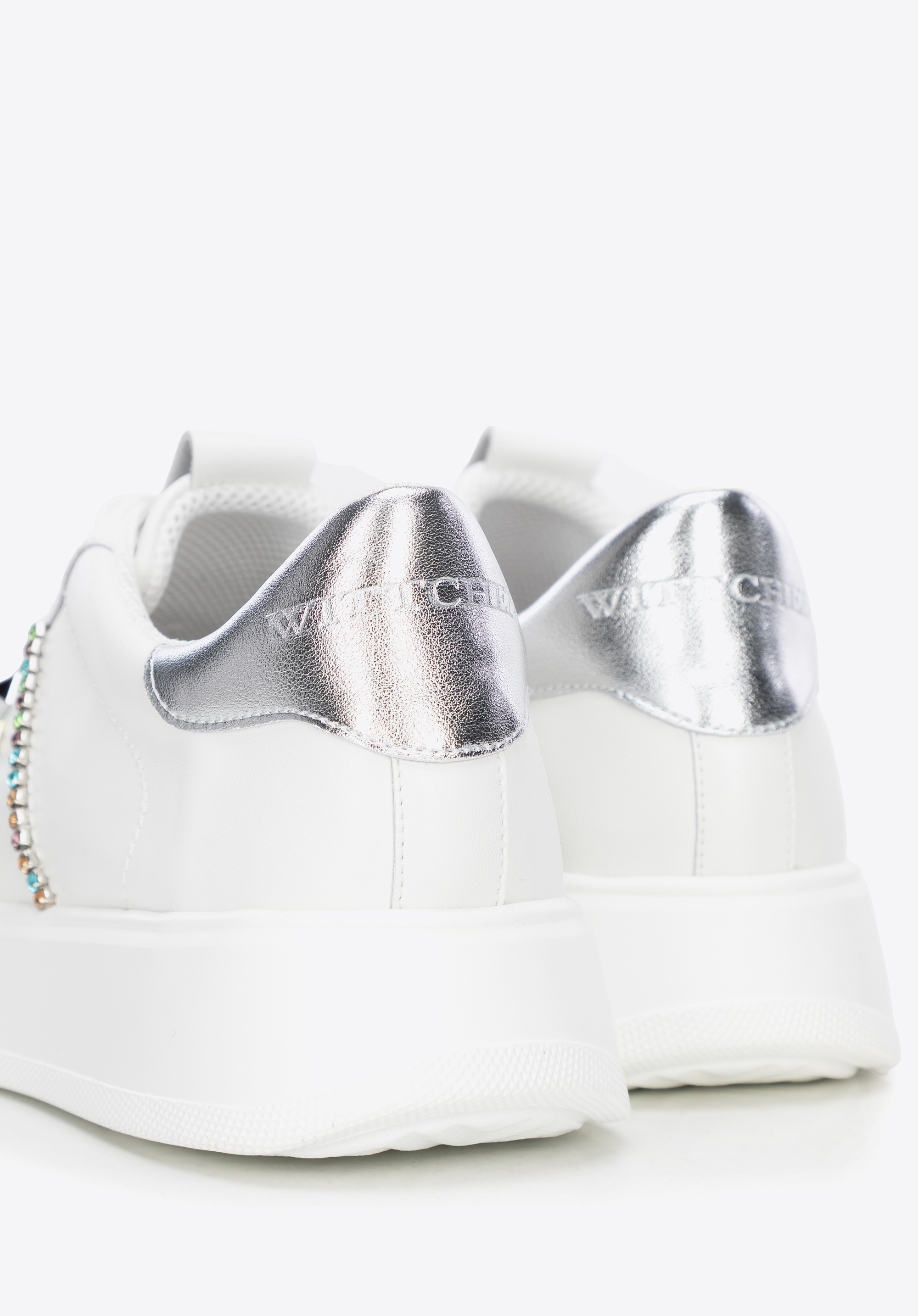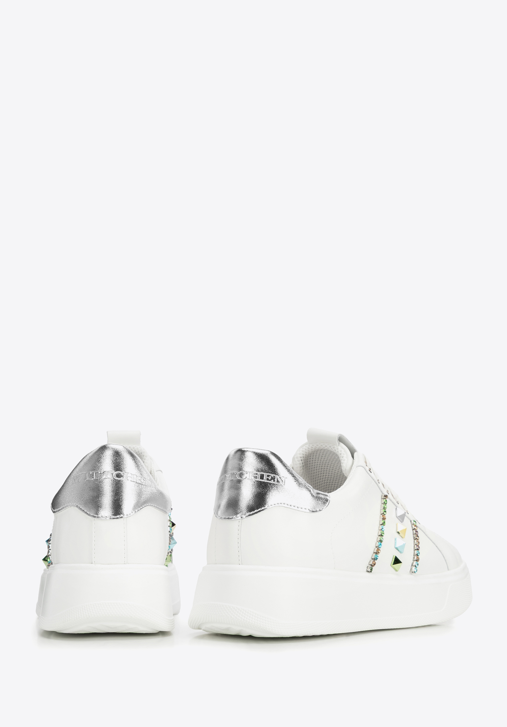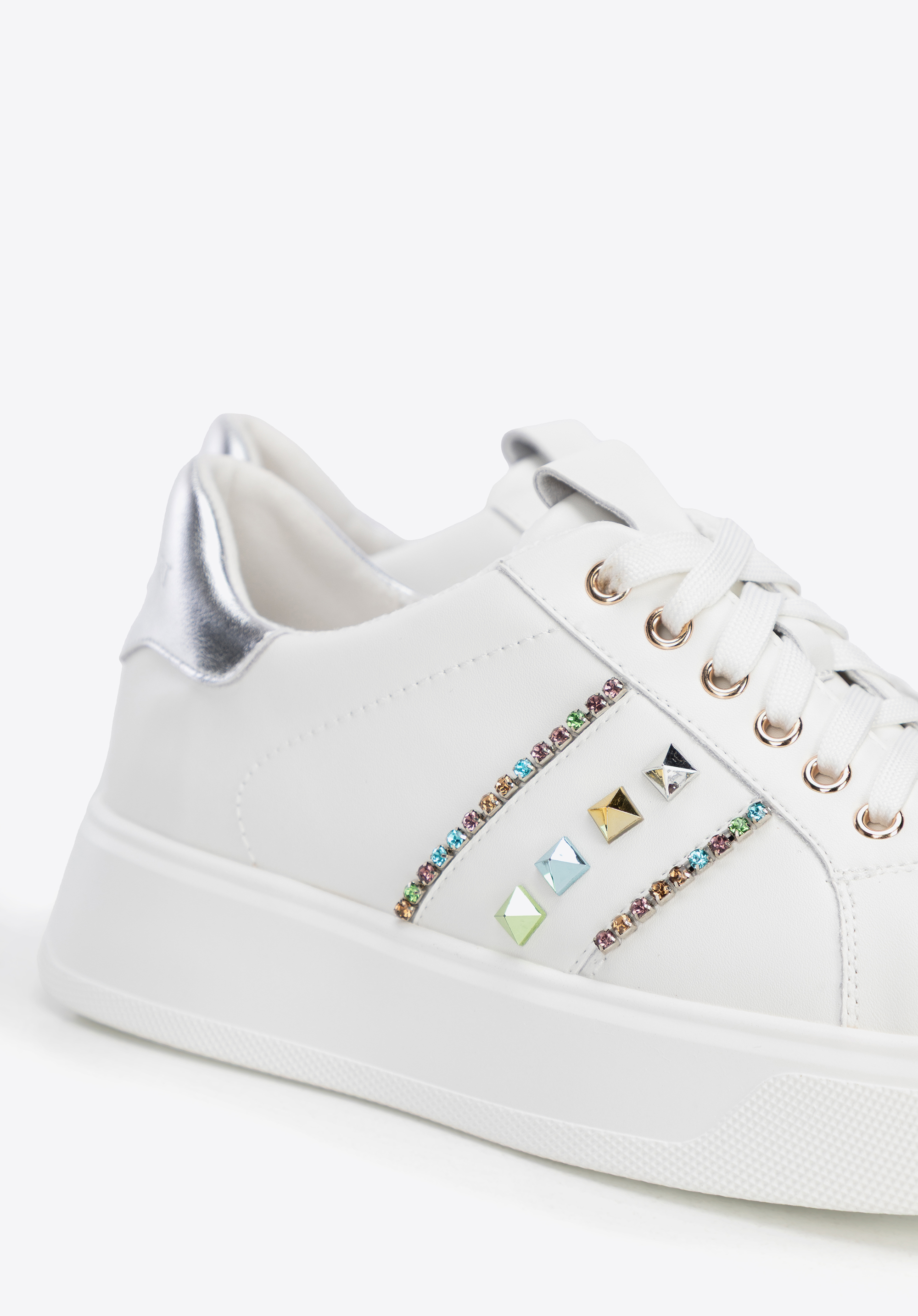 Acești sneakerşi moderni pentru femei combină un design contemporan cu confortul și un stil puternic conturat. Realizați din piele ecologică, cu vârf rotund și talpă tip platformă, oferă siluetei un plus de lejeritate, menținând totodată confortul pe durata întregii zile. Detaliile de tip bijuterie de pe laterale atrag privirile și conferă un caracter unic ținutei.