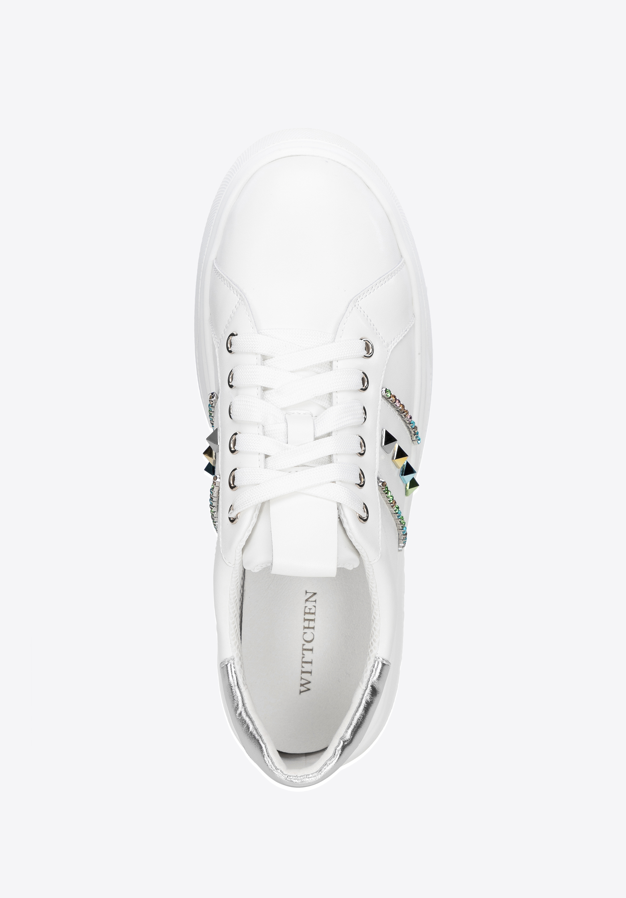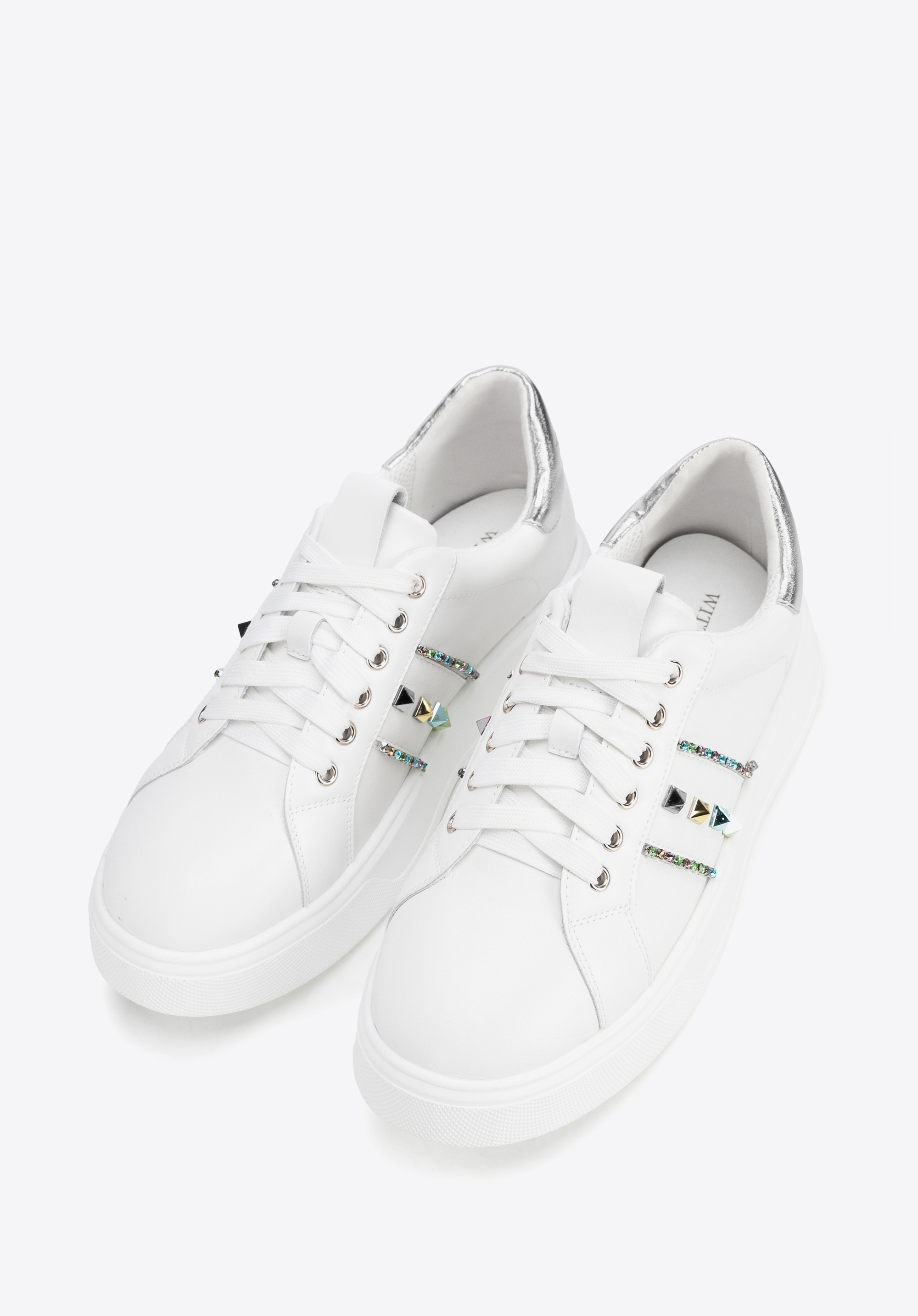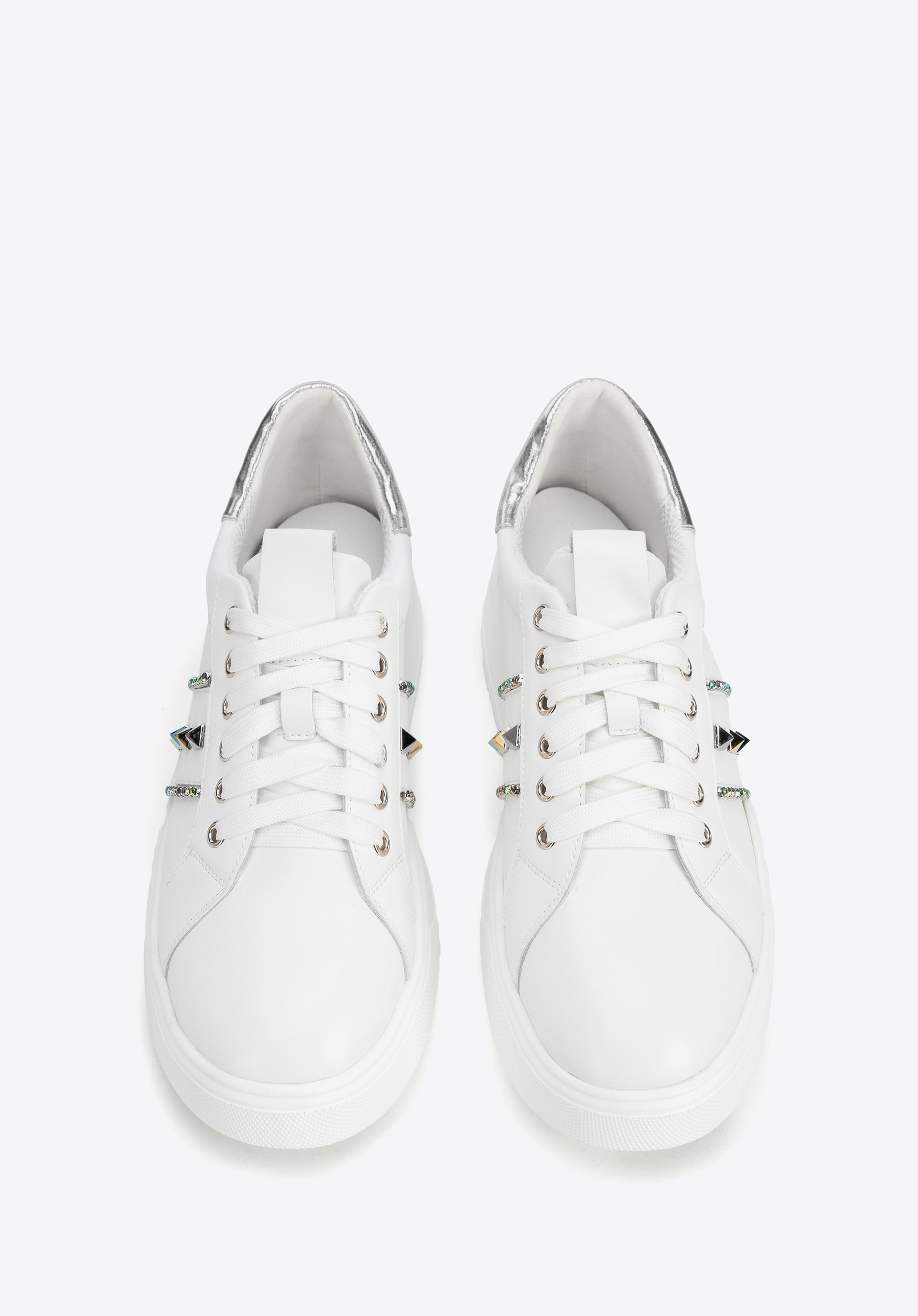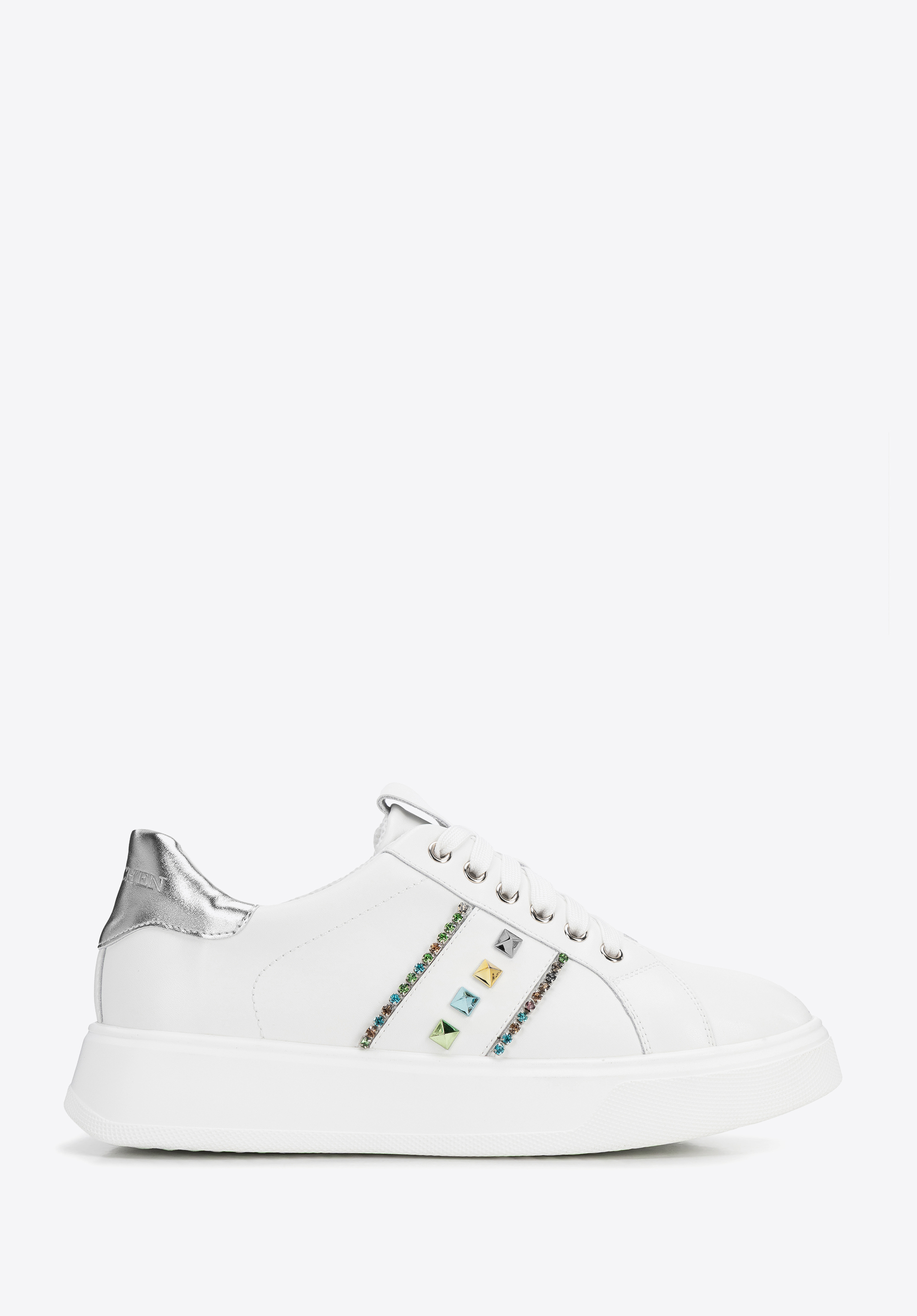 Acești sneakerşi moderni pentru femei combină un design contemporan cu confortul și un stil puternic conturat. Realizați din piele ecologică, cu vârf rotund și talpă tip platformă, oferă siluetei un plus de lejeritate, menținând totodată confortul pe durata întregii zile. Detaliile de tip bijuterie de pe laterale atrag privirile și conferă un caracter unic ținutei.