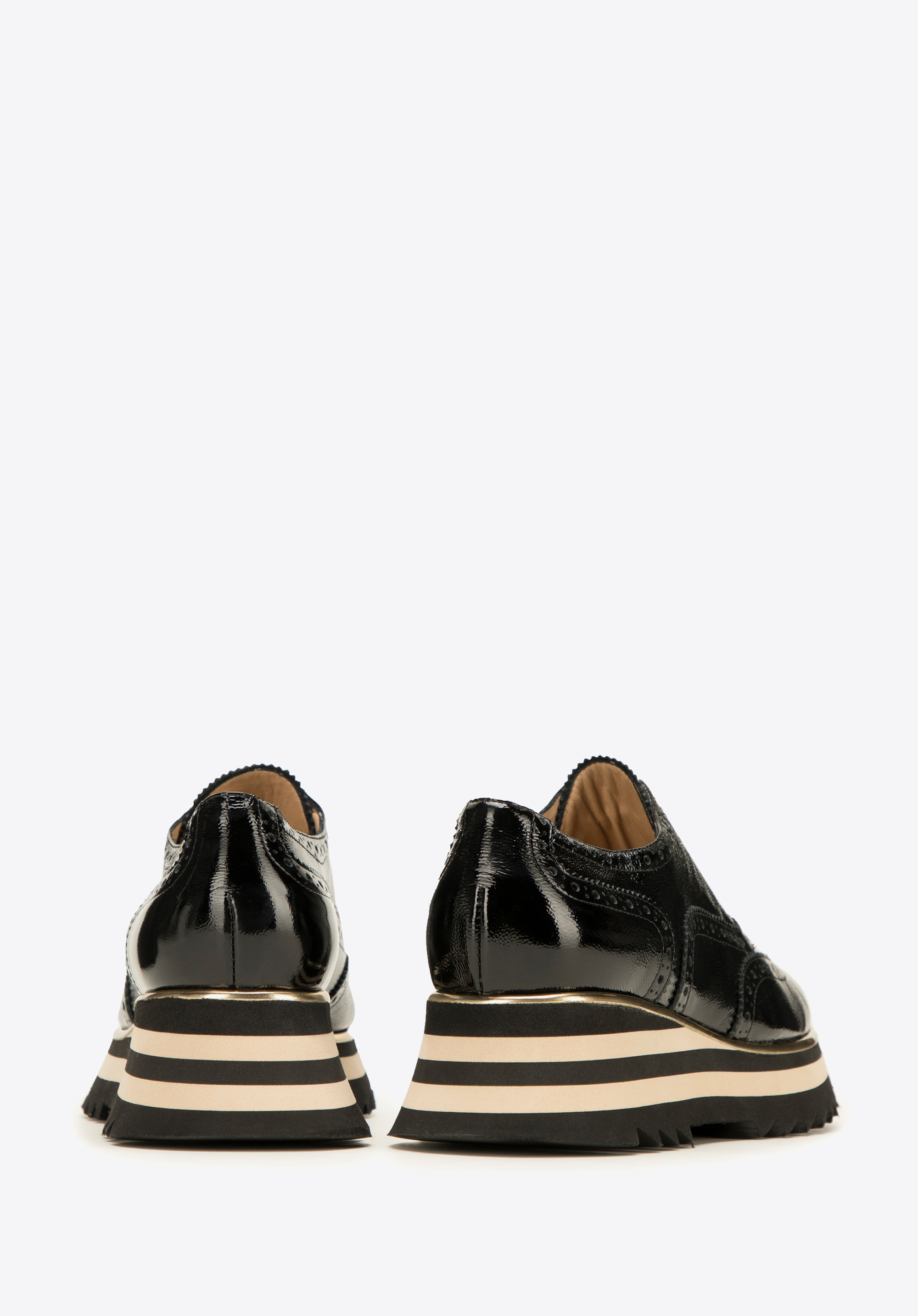 Design: Atrage atenția: piele lăcuită lucioasă si perforatii pe vârf, iar pe partea superioară forma de aripioare cu găuri si cusături.