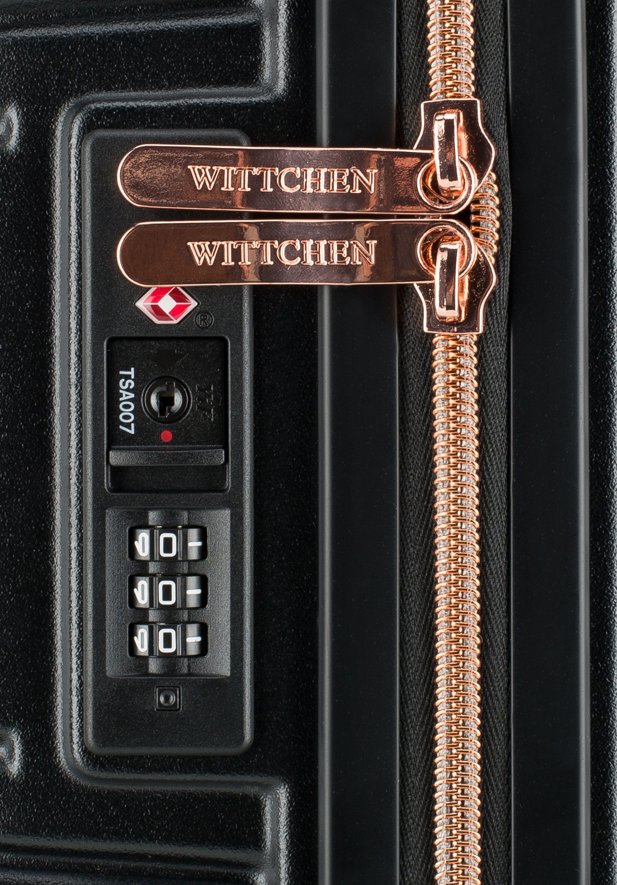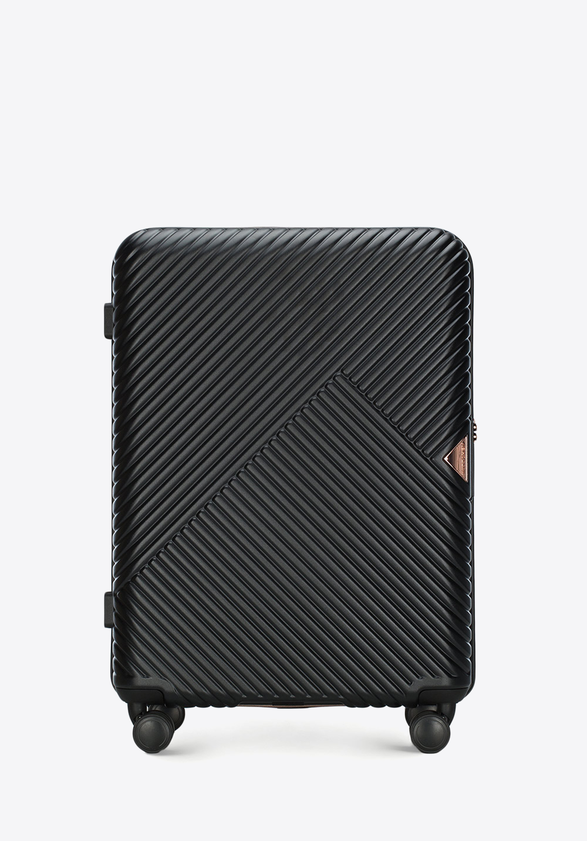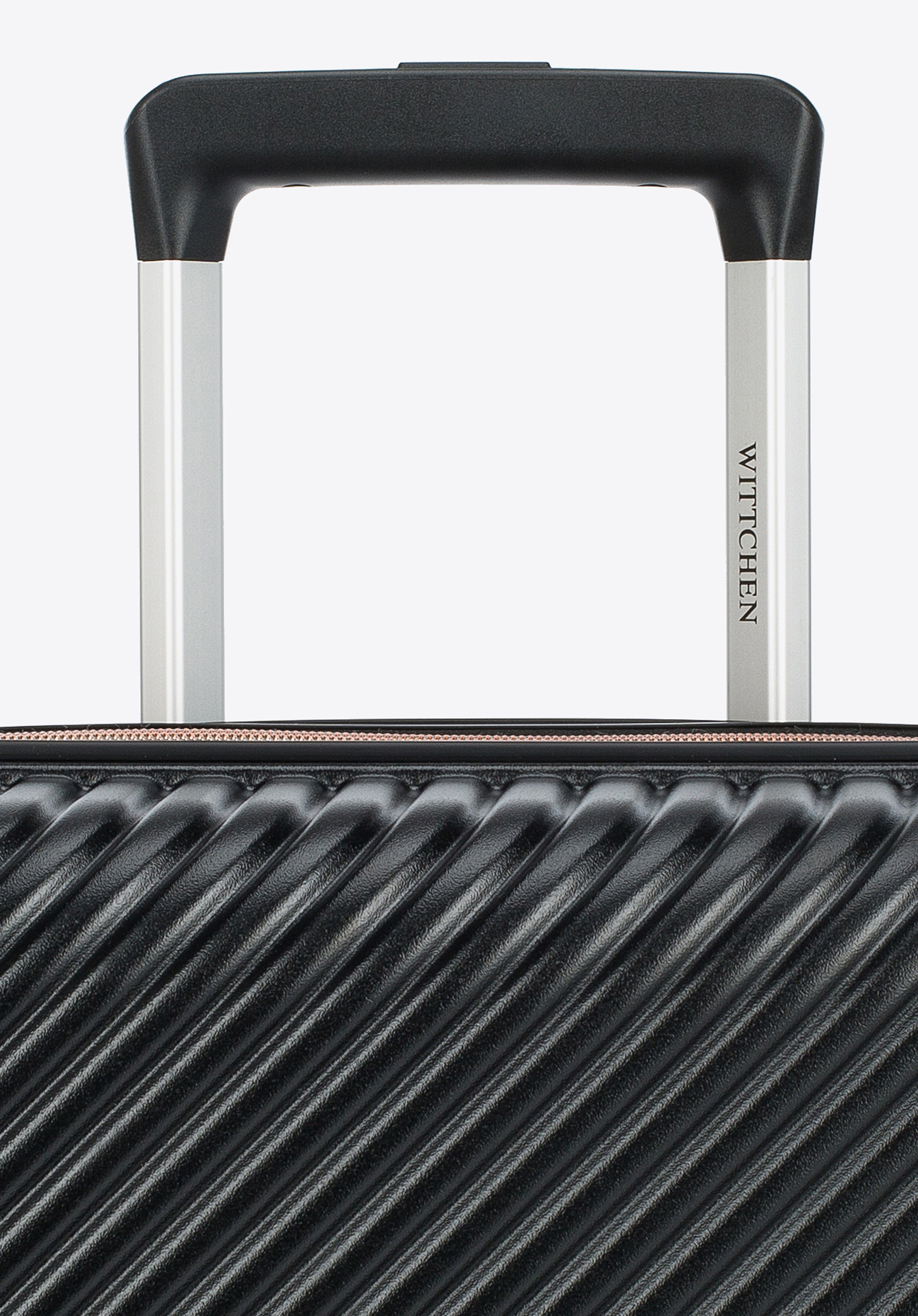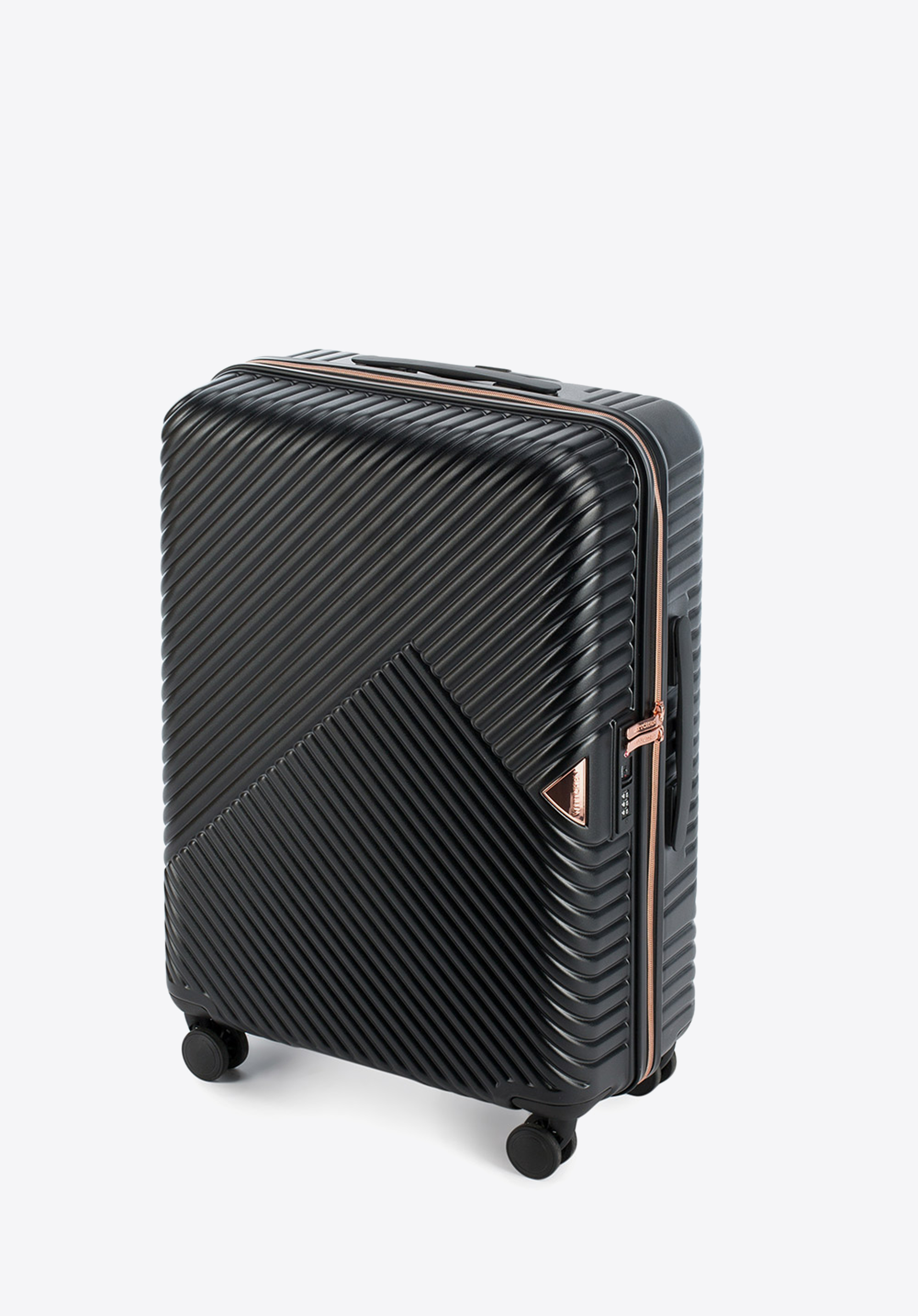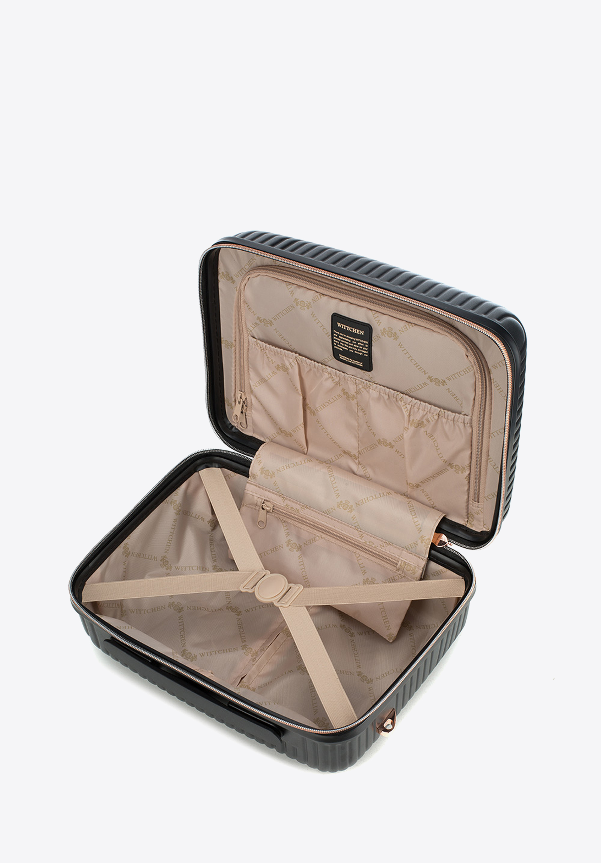 Valize din policarbonat cu un finisaj mat.Este un proiect de designer cu accesorii strălucitoare în aur roz.Roți din ABS cu acoperire flexibilă.Interiorul bagajului este acoperit cu o căptușeală bej cu sigla WITTCHEN.Modelul este disponibil în trei nuanțe: alb , negru și roz .