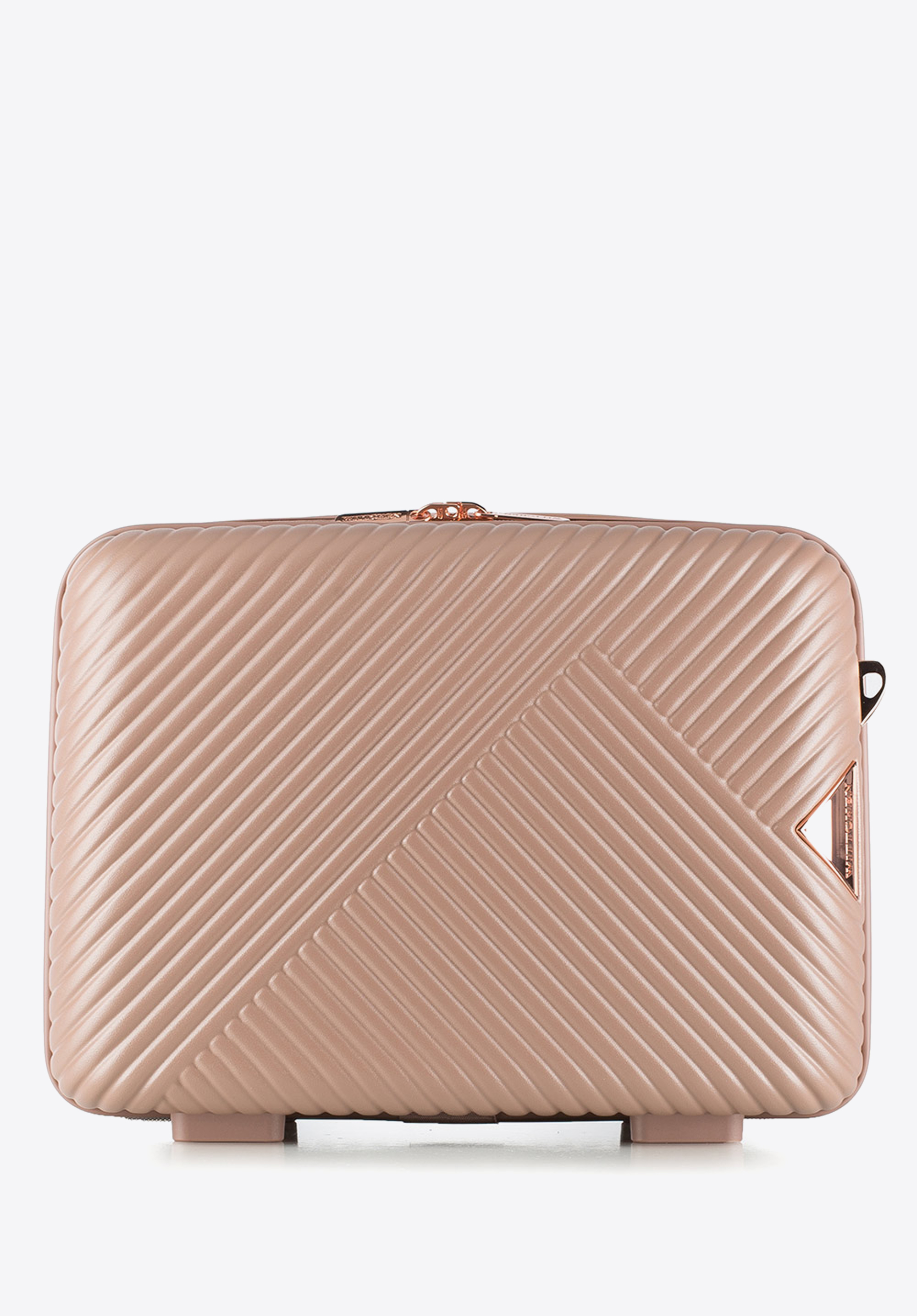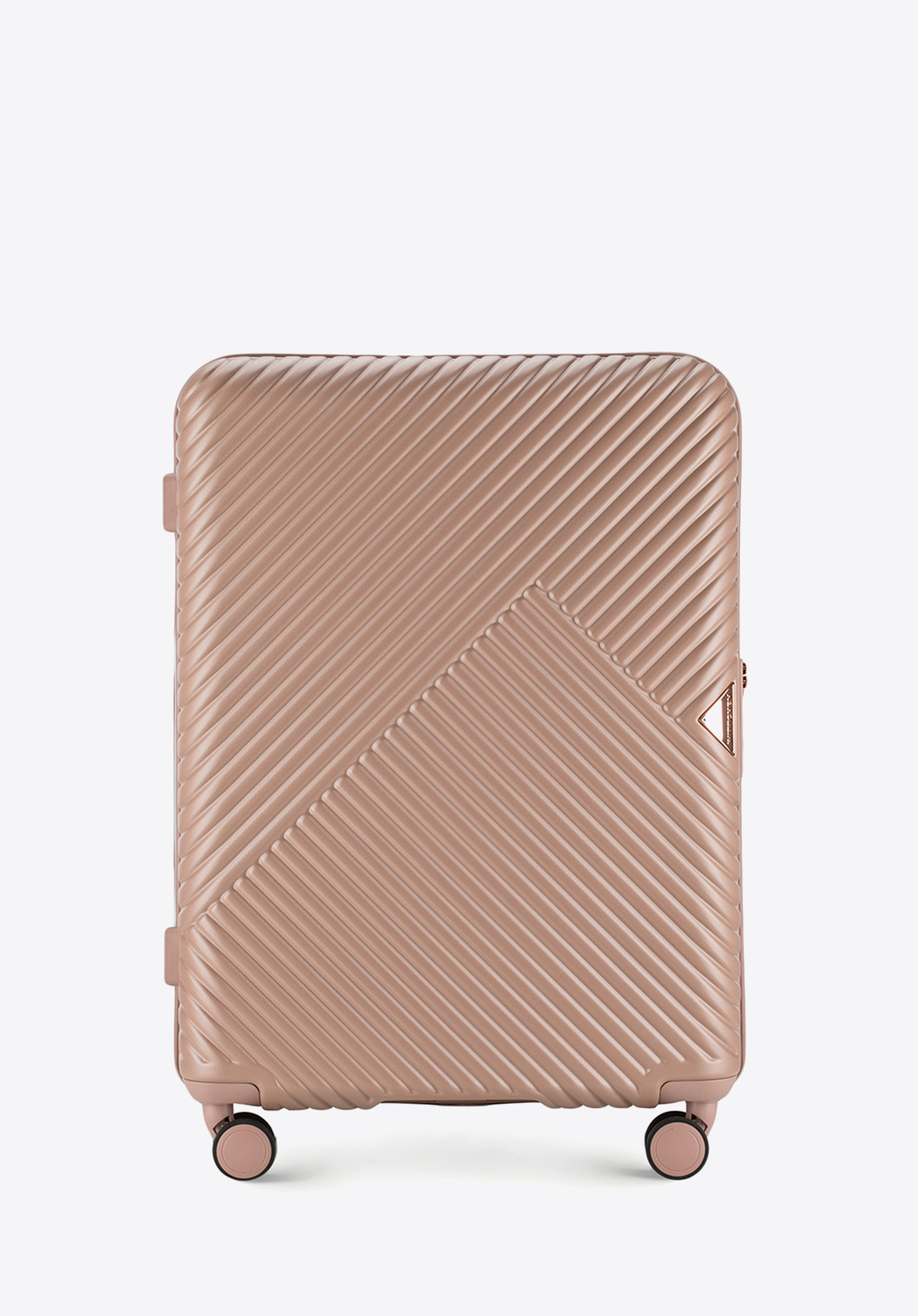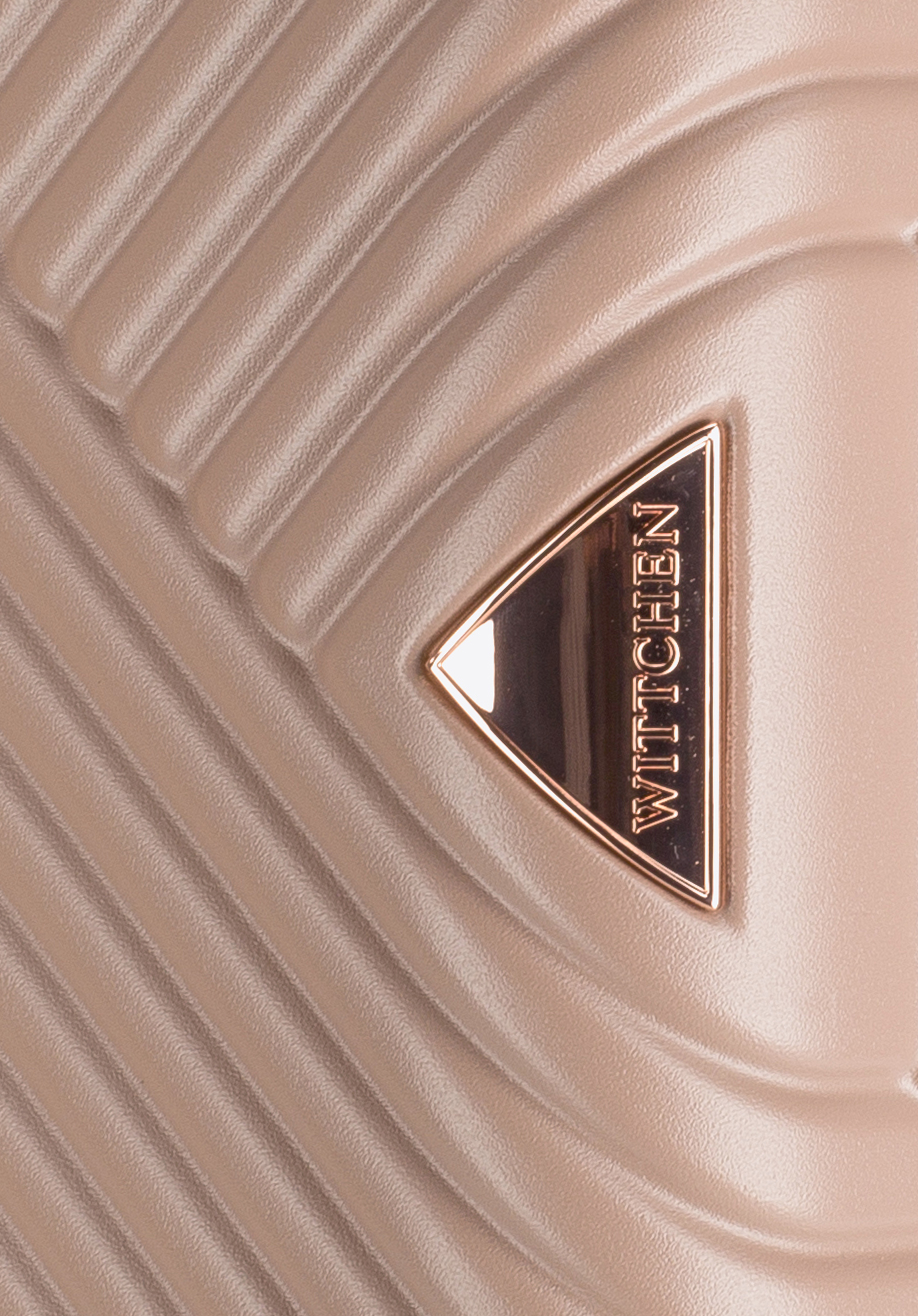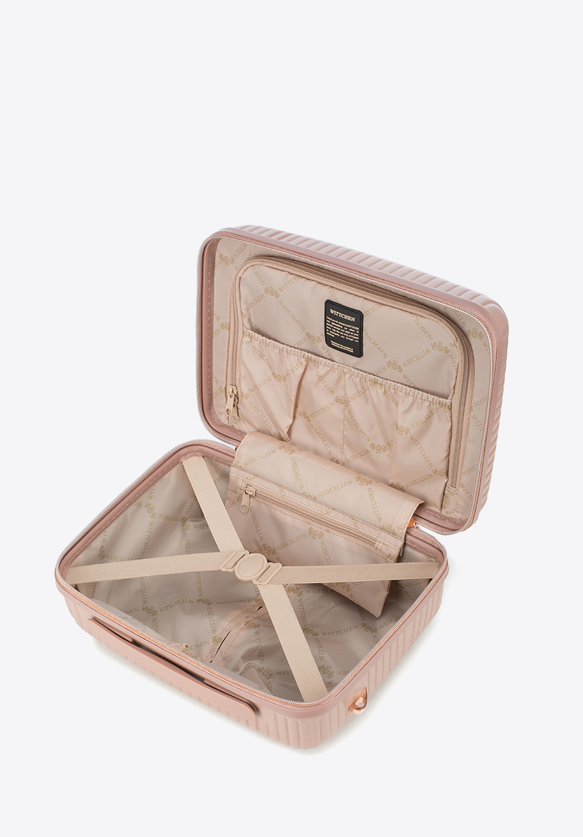 Valize din policarbonat cu un finisaj mat.Este un proiect de designer cu accesorii strălucitoare în aur roz.Roți din ABS cu acoperire flexibilă.Interiorul bagajului este acoperit cu o căptușeală bej cu sigla WITTCHEN.Modelul este disponibil în trei nuanțe: alb , negru și roz .