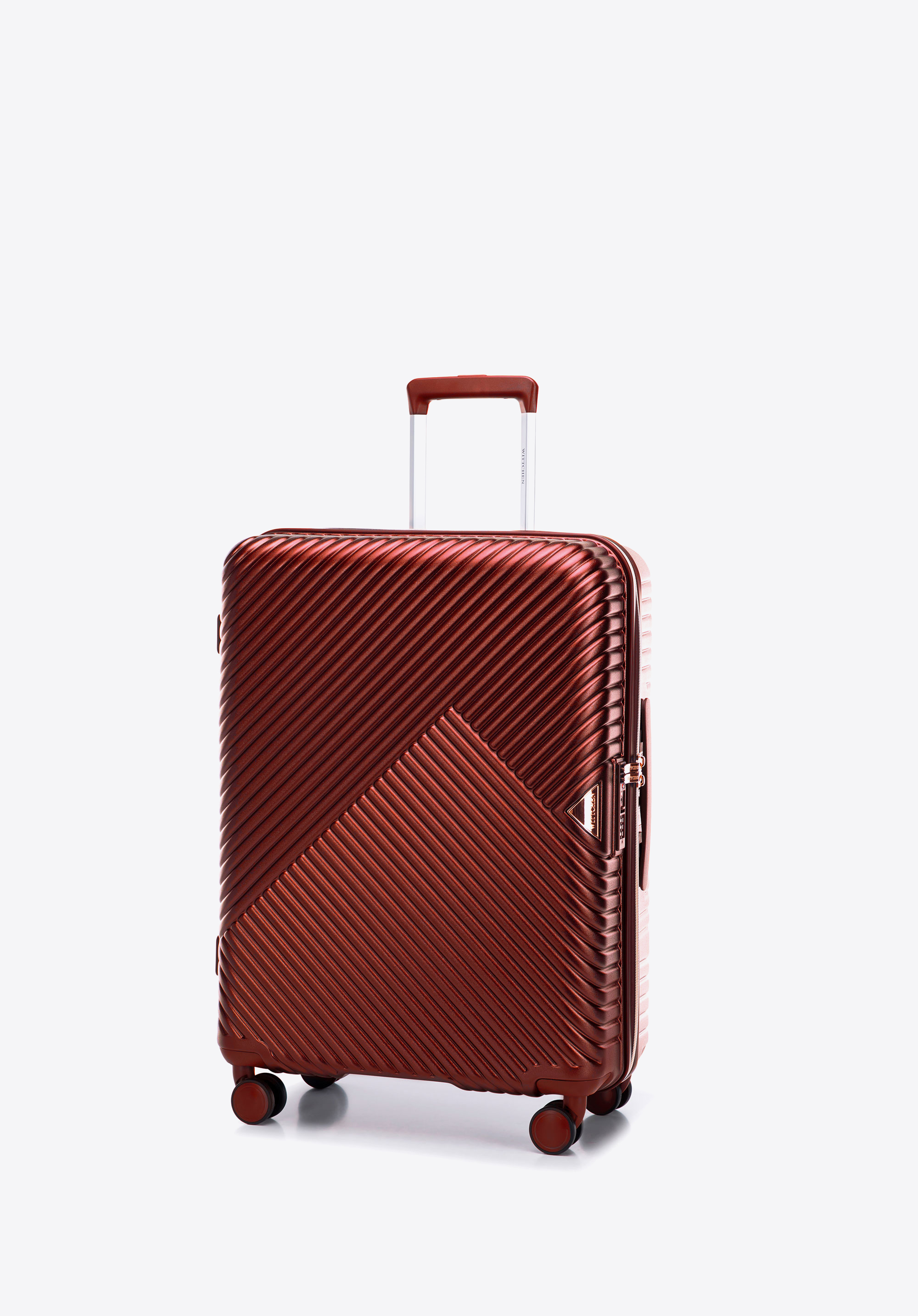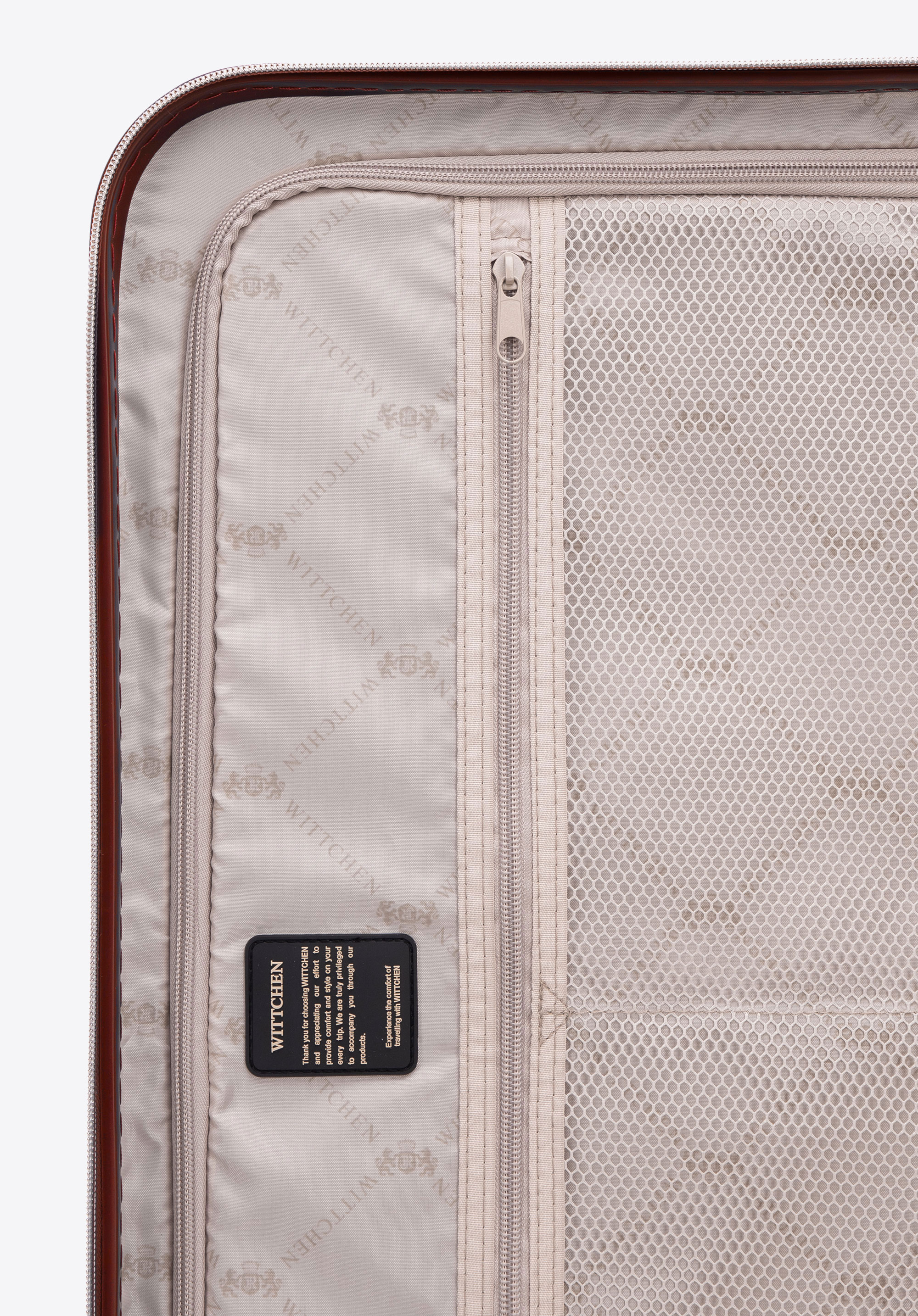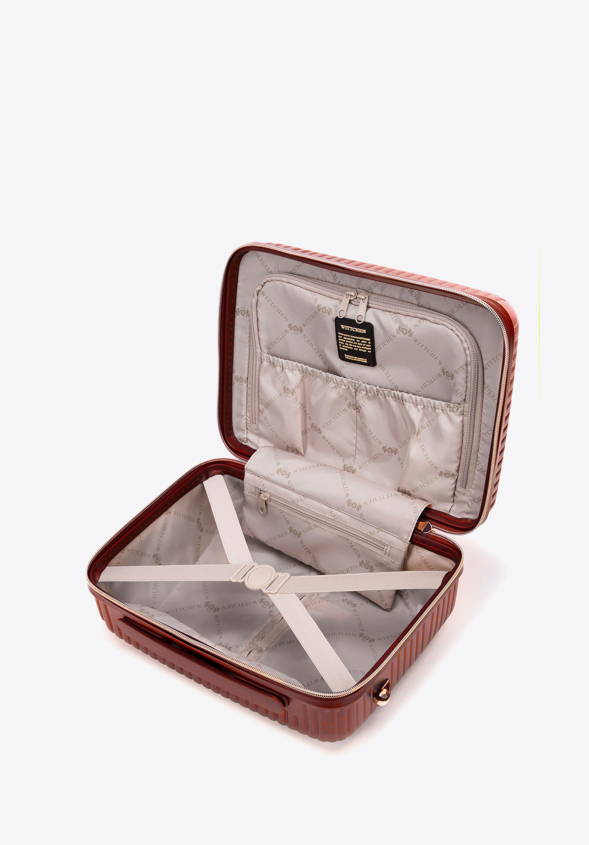 Valize din policarbonat cu un finisaj mat.Este un proiect de designer cu accesorii strălucitoare în aur roz.Roți din ABS cu acoperire flexibilă.Interiorul bagajului este acoperit cu o căptușeală bej cu sigla WITTCHEN.Modelul este disponibil în trei nuanțe: alb , negru și roz .