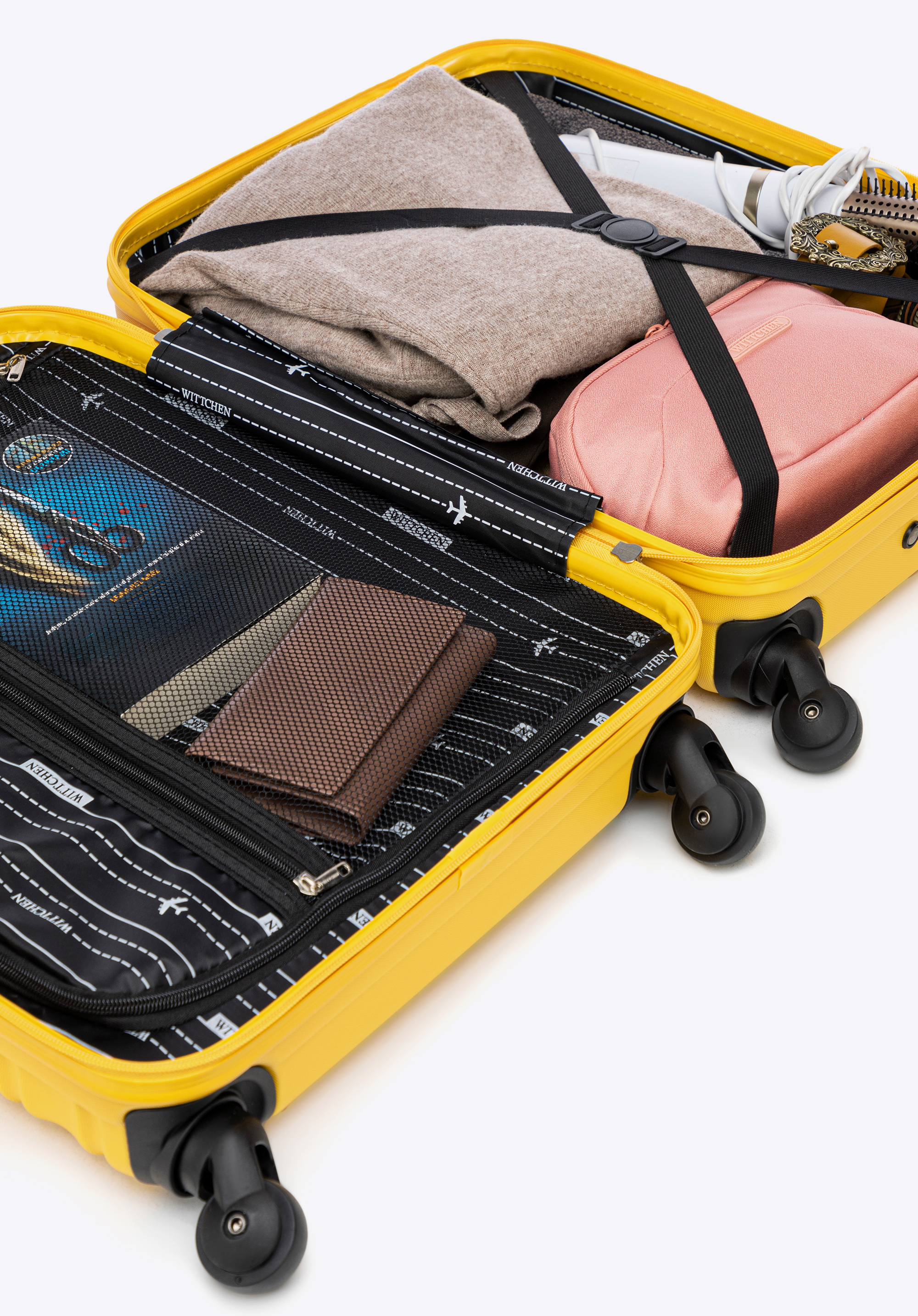 - Caracteristici principale:Interior perfect conceput: interiorul valizei este împărțit în două compartimente. Un compartiment este fixat cu benzi elastice care se adaptează 100% la dimensiunea bagajului dvs. și îl fixează împotriva mișcării. Al doilea compartiment, fixat cu fermoar, este ideal pentru transportul obiectelor mici.