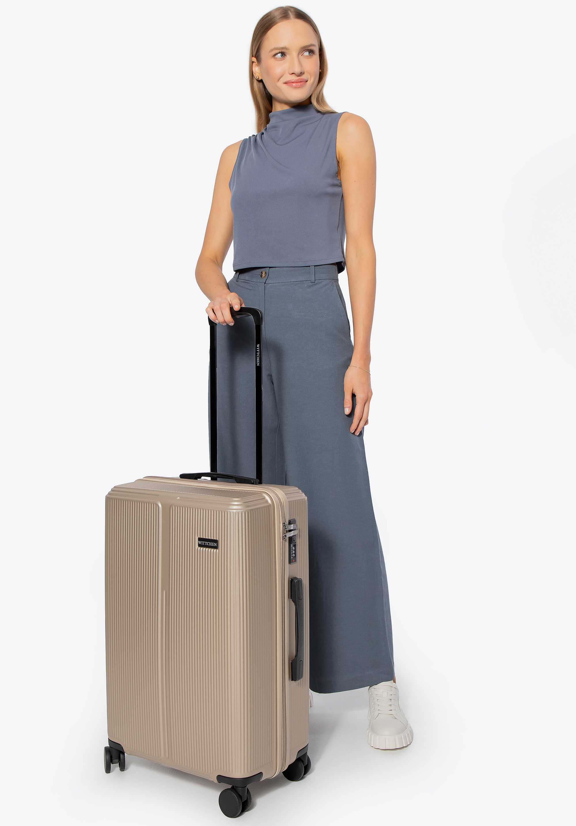 - Design: Canelurile verticale și detaliile negre oferă valizei un aspect modern.