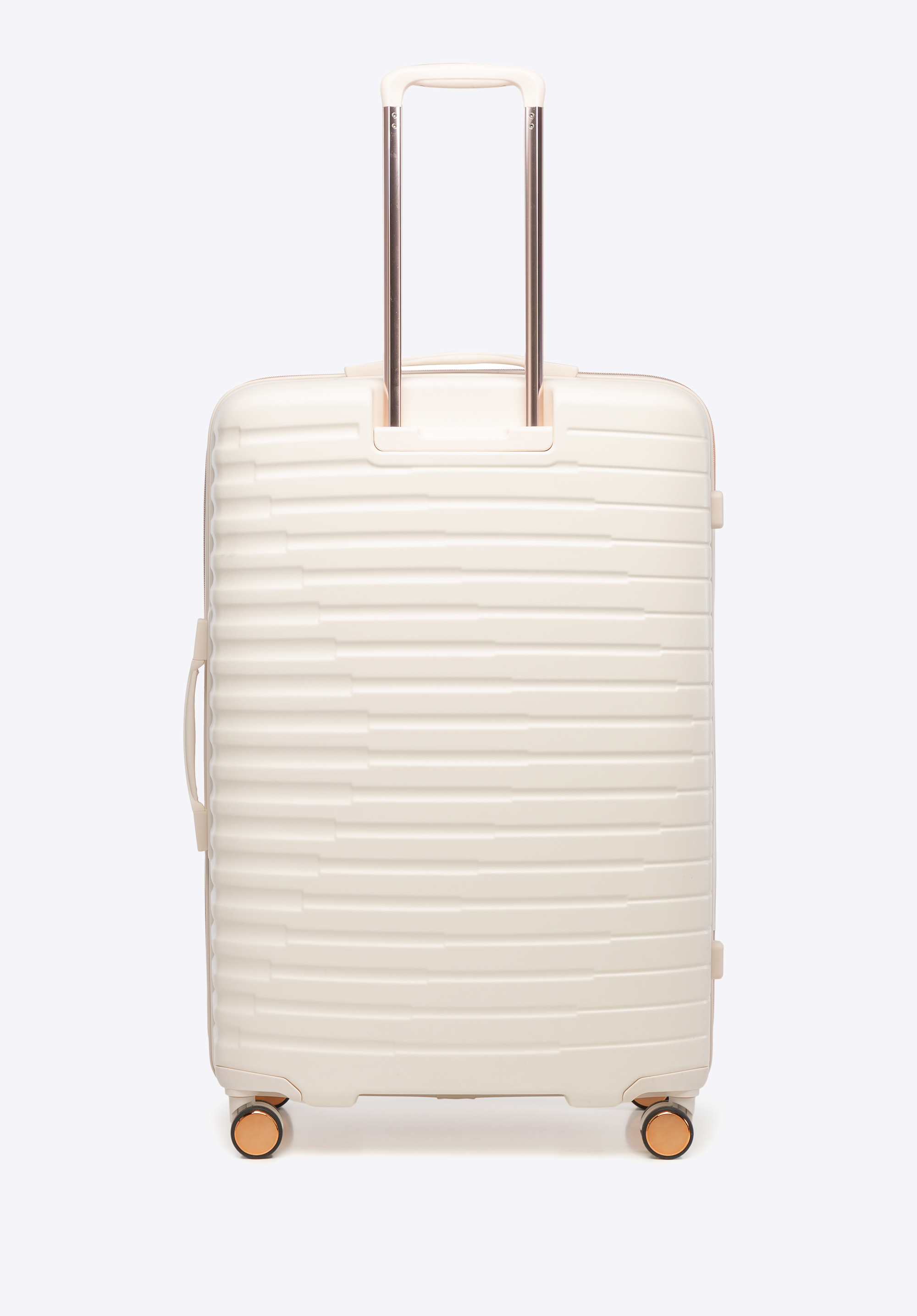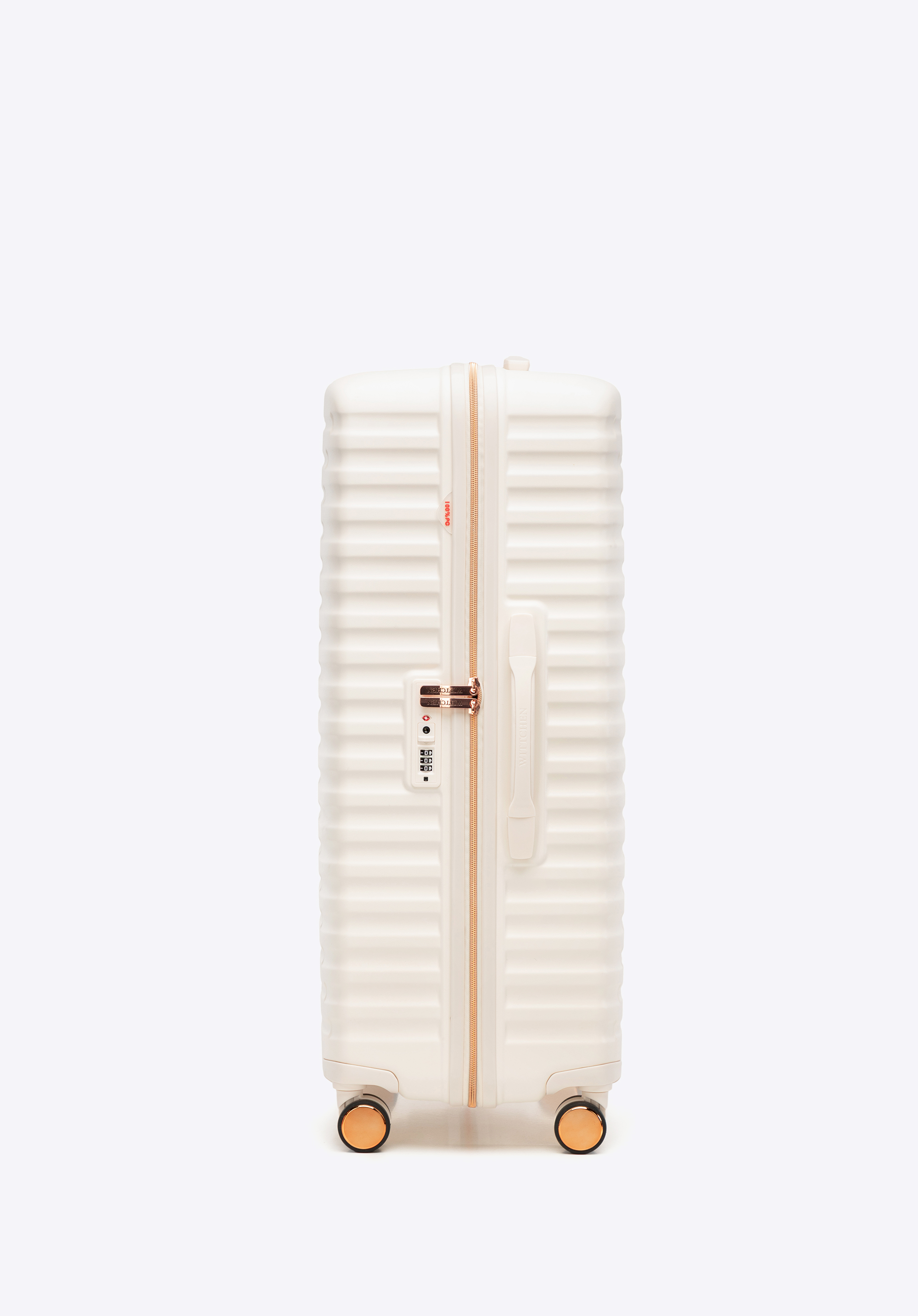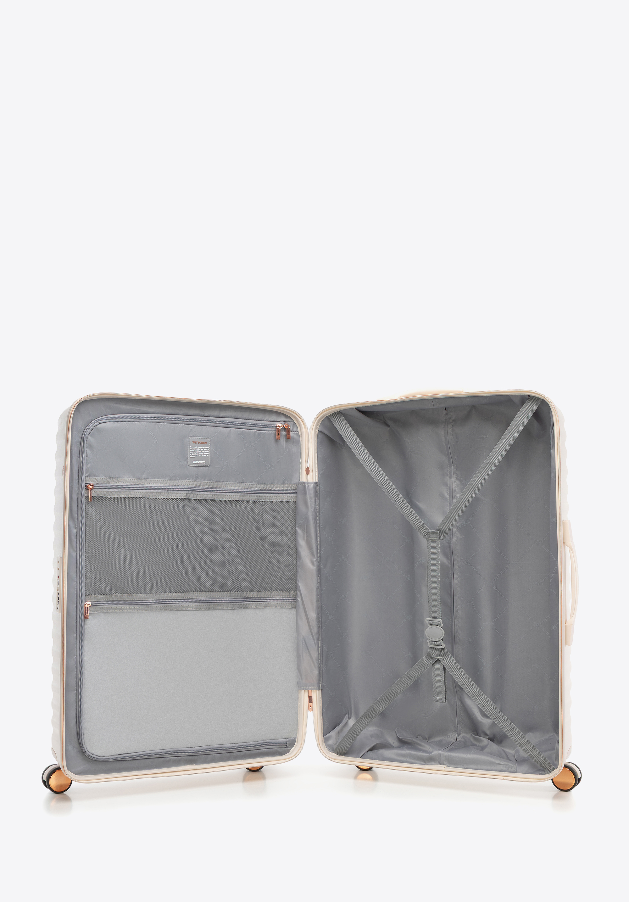 Cauți o valiză elegantă și practică pentru călătorii mai lungi? Valiza noastră din policarbonat este soluția perfectă pentru cei care nu vor să facă compromisuri în ceea ce privește stilul sau funcționalitatea. O construcție ușoară, dar extrem de durabilă, este completată de un interior spațios cu compartimente practice. Patru roți duble pivotante și un mâner telescopic cu funcție de blocare asigură o manevrare lină, în timp ce două mânere robuste (superioare și laterale) oferă un transport confortabil.