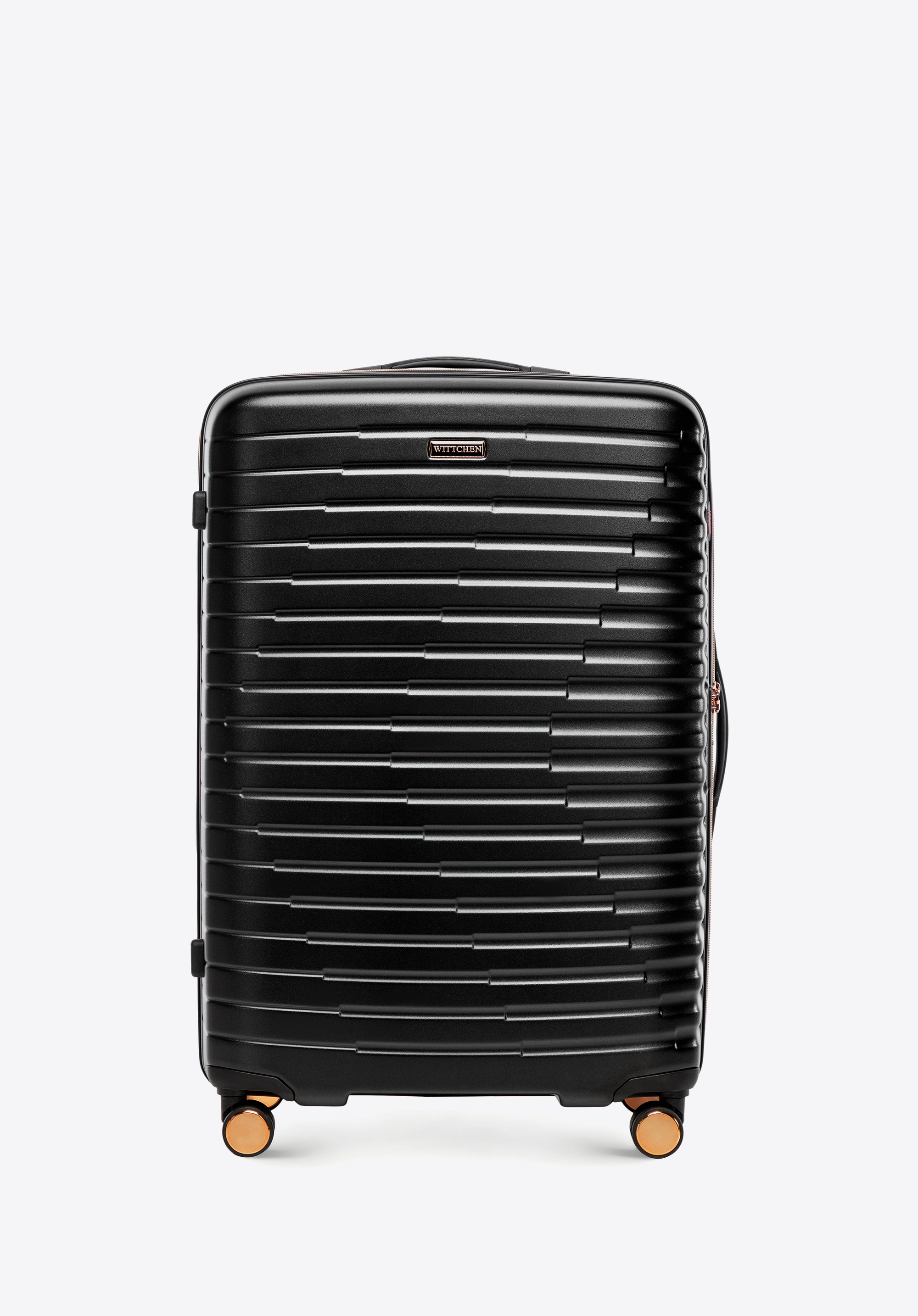 Valiză mare din policarbonat cu caneluri orizontale negru-auriu