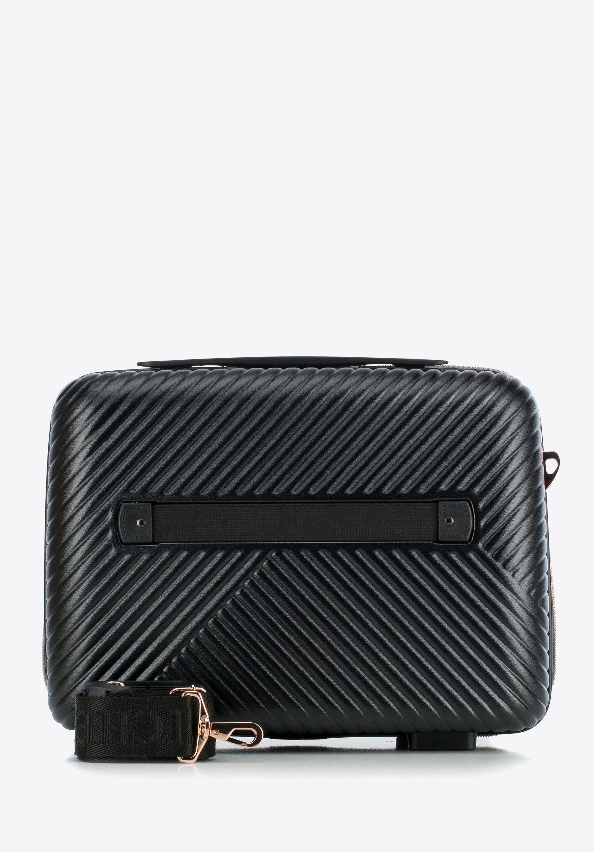 - Geantă cosmetică: Echipată cu un mâner confortabil, o curea de umăr detașabilă și reglabilă , precum și o bandă elastică pentru fixare sigură pe mânerul valizei.