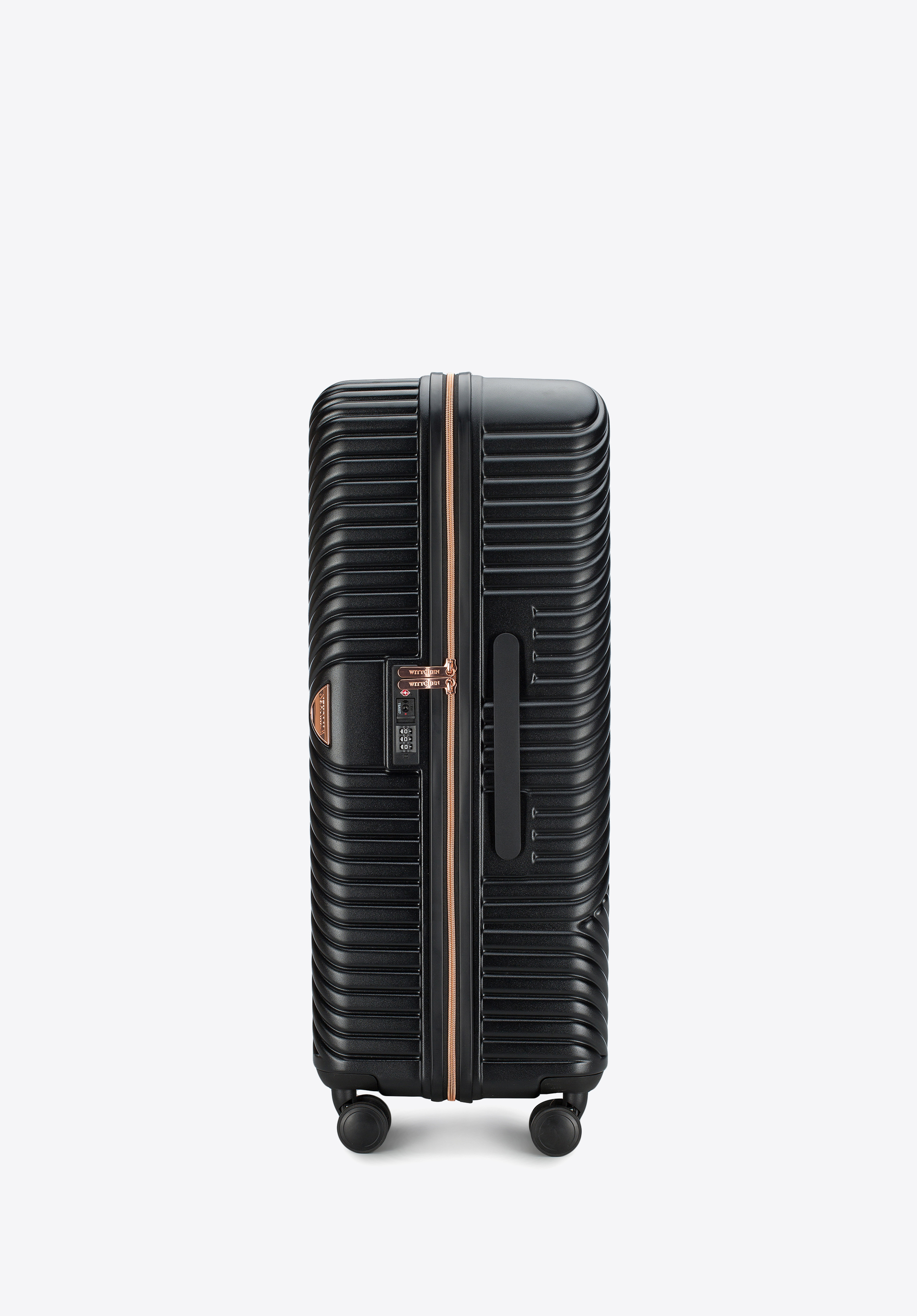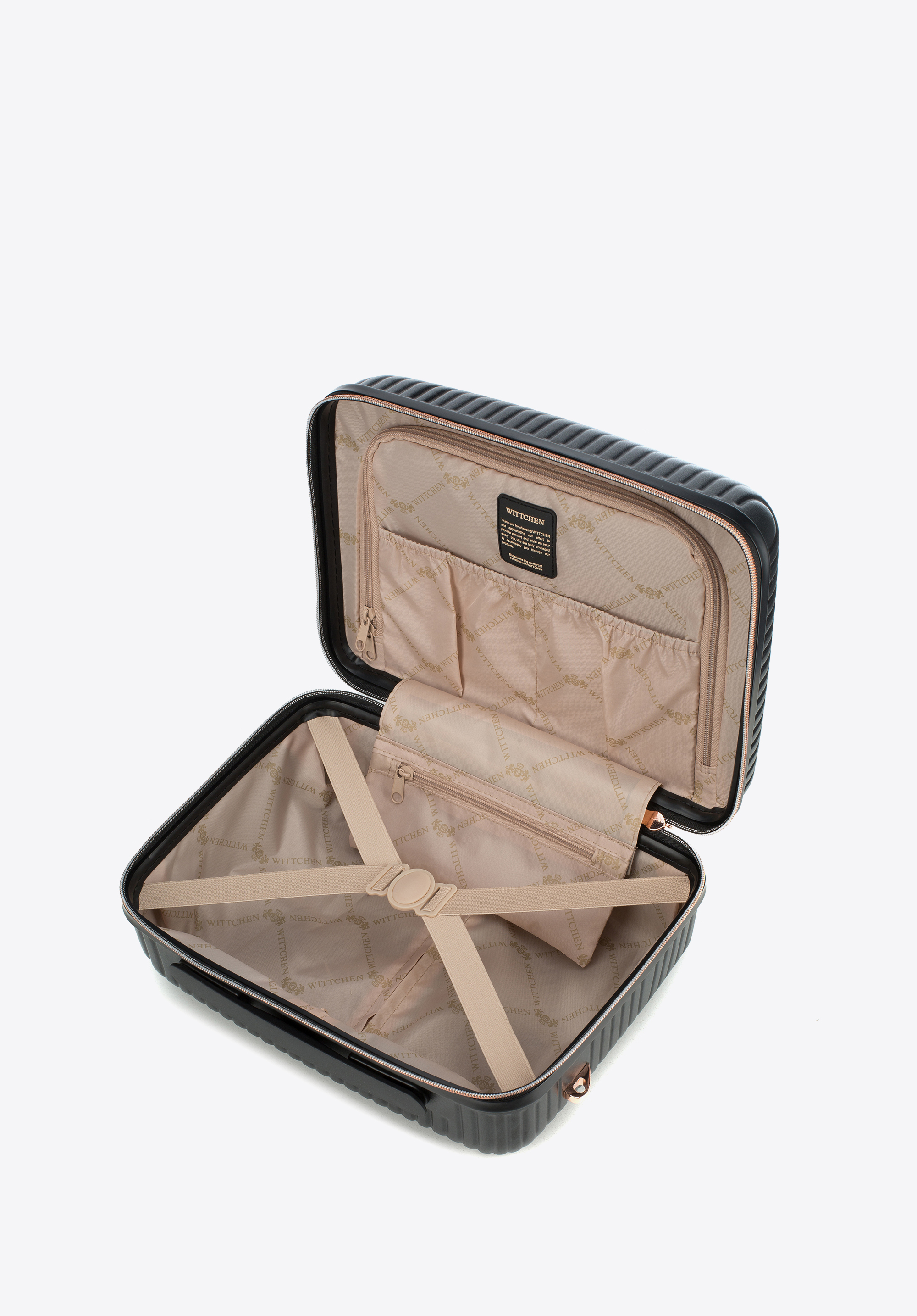 - Interior valizei: Compartiment principal cu curele de fixare; compartiment cu fermoar; două buzunare din plasă și un buzunar suplimentar cu fermoar – toate finisate cu o căptușeală bej cu sigla WITTCHEN.