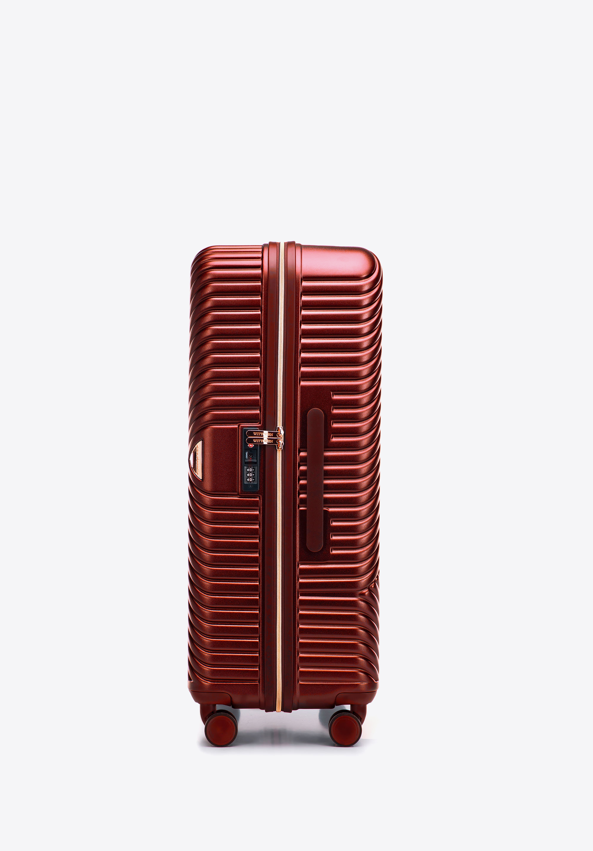 - Interior valizei: Compartiment principal cu curele de fixare; compartiment cu fermoar; două buzunare din plasă și un buzunar suplimentar cu fermoar – toate finisate cu o căptușeală bej cu sigla WITTCHEN.