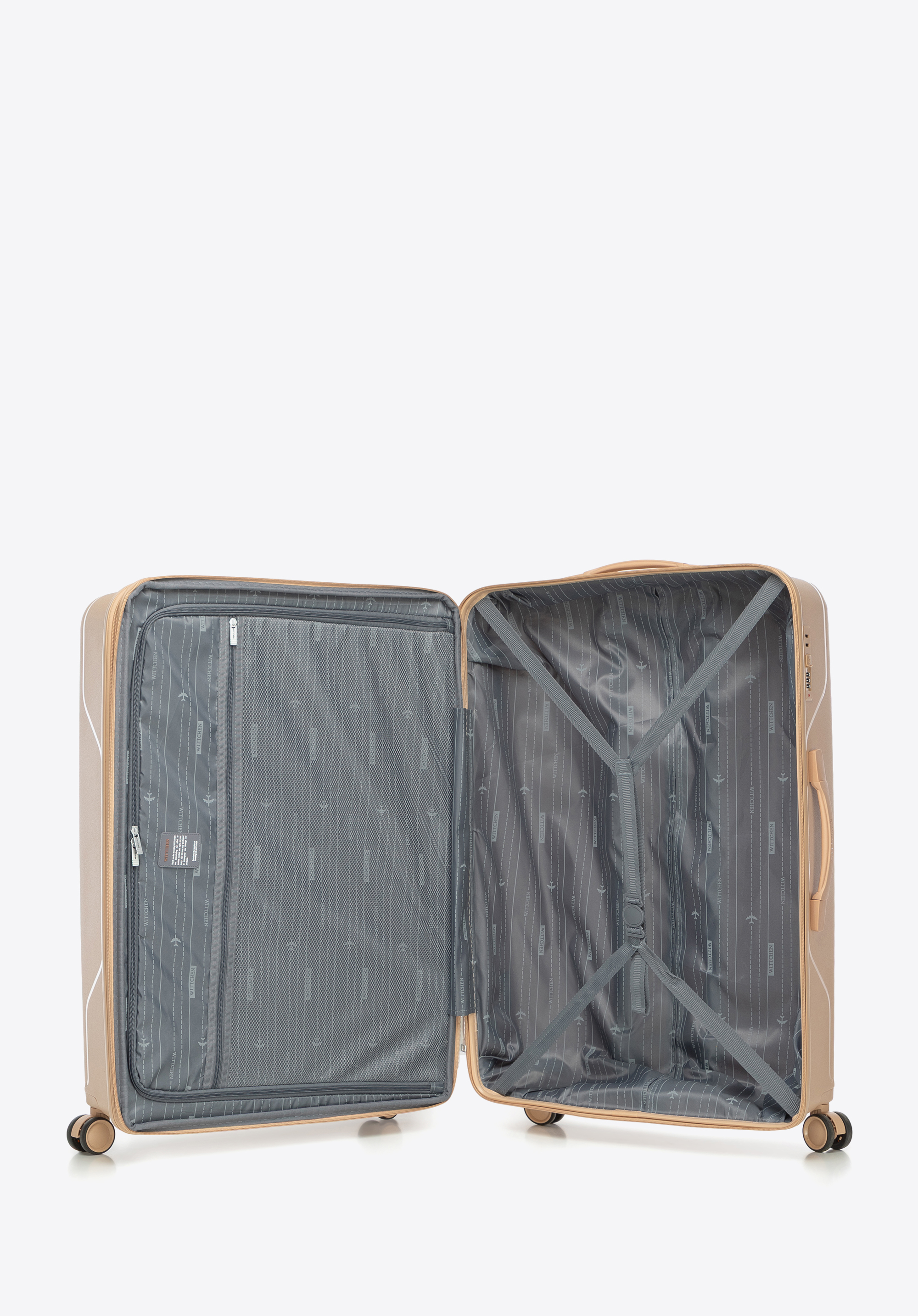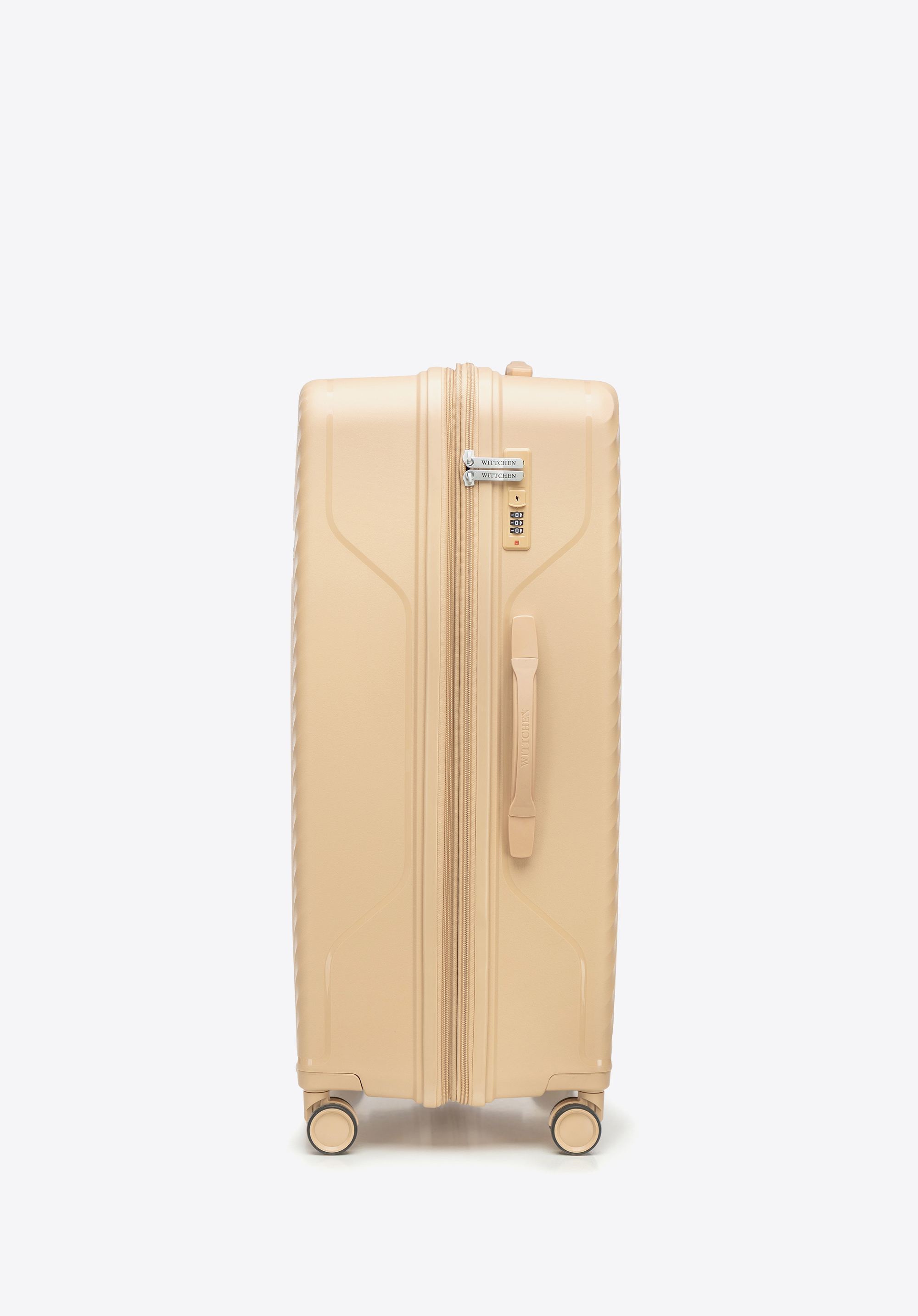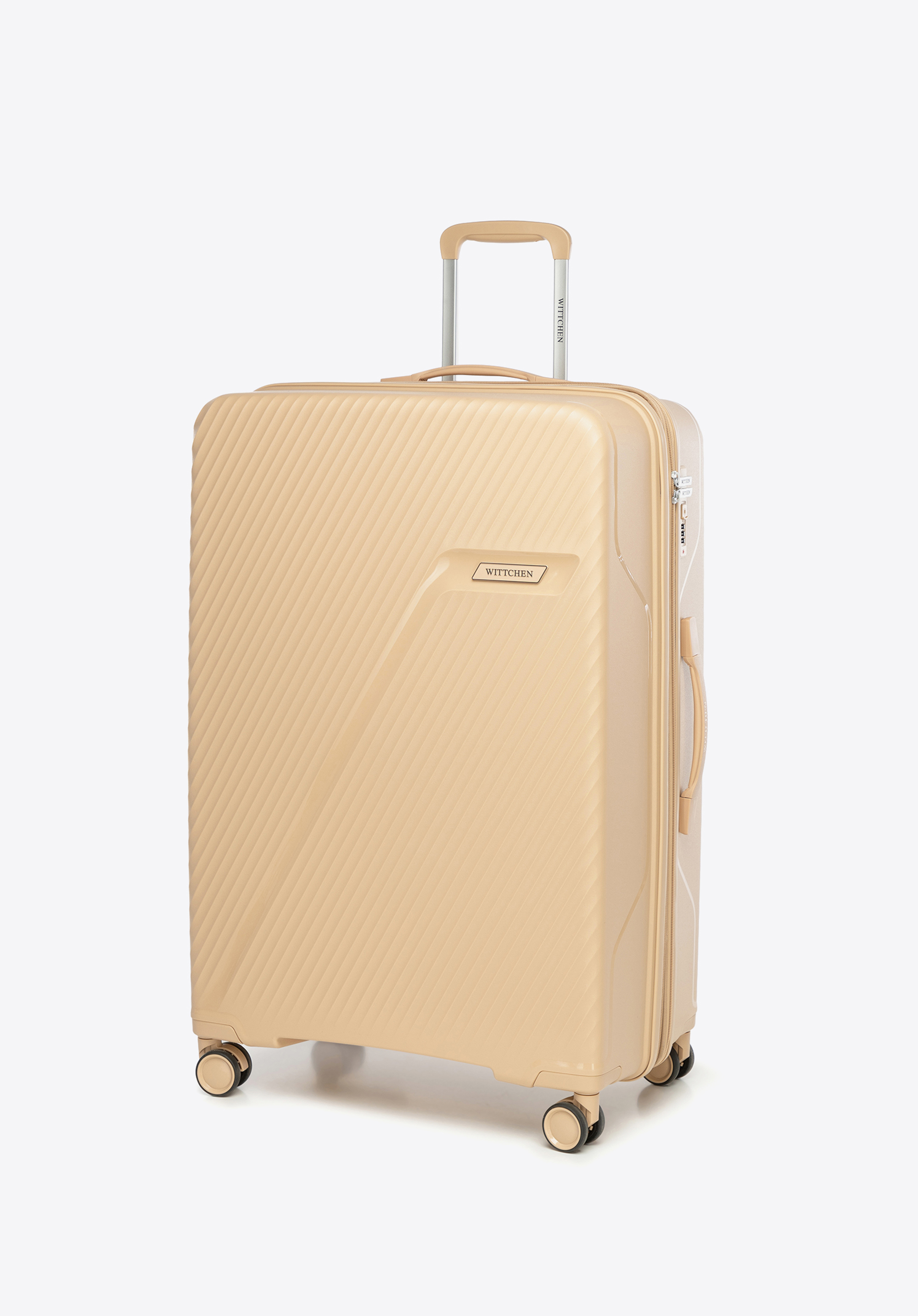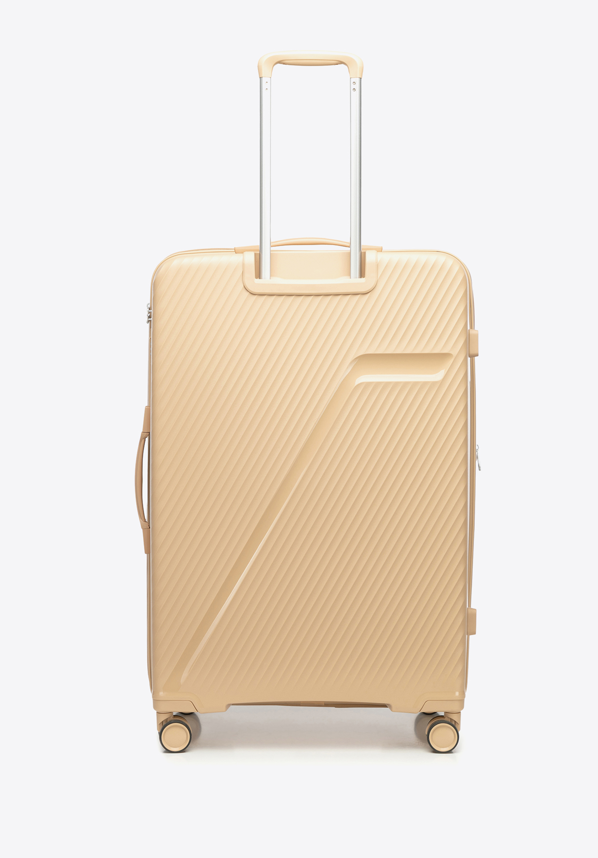 Valiză mare din polipropilenă cu dungi diagonale, bej