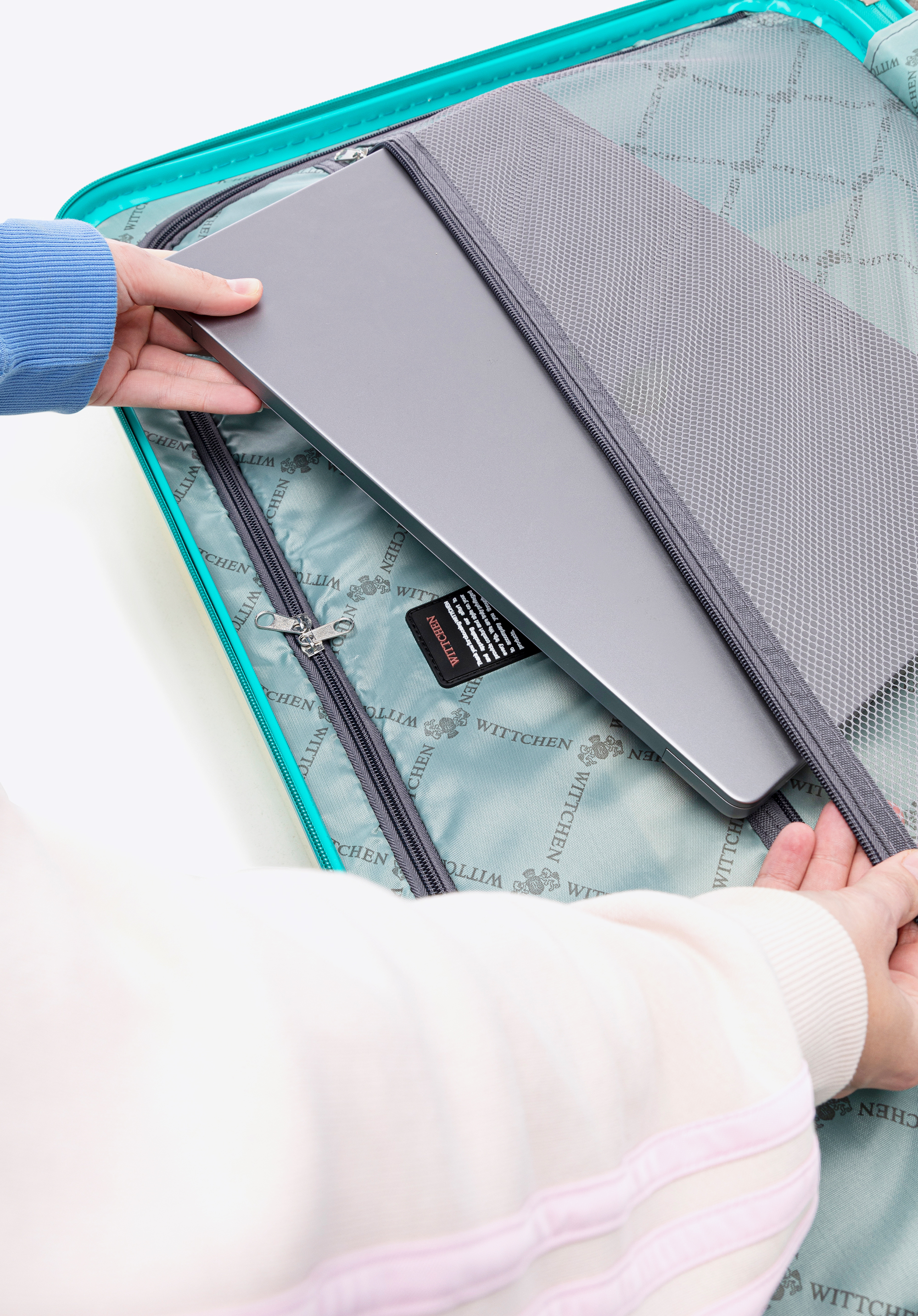 - Detalii de design: Modelele dinamice creează un aspect remarcabil. O folie protectoare transparentă acoperă atât valiza, cât și trusa cosmetică, pentru o protecție suplimentară a suprafeței.