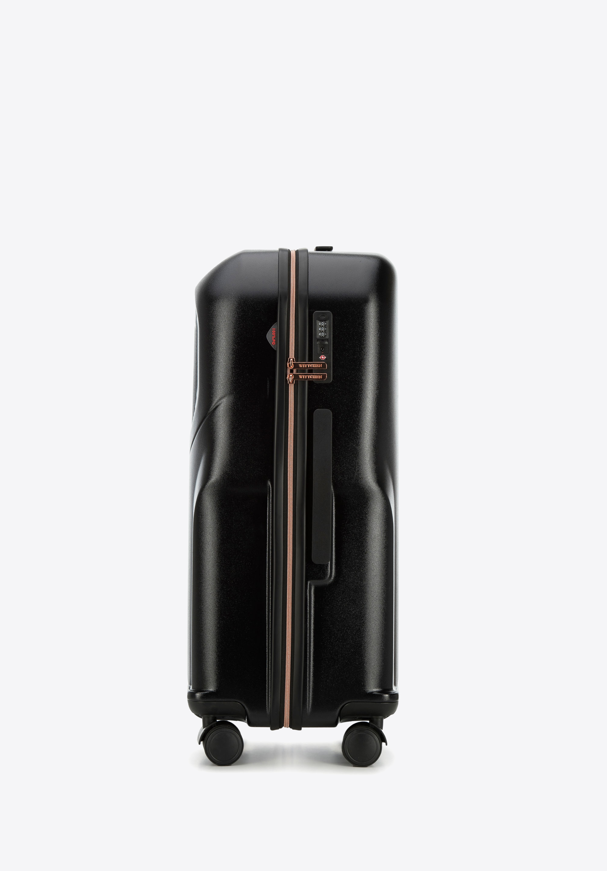 - Design: Nervurile elegante și accentele aurii-roz conferă valizei un aspect modern și elegant.