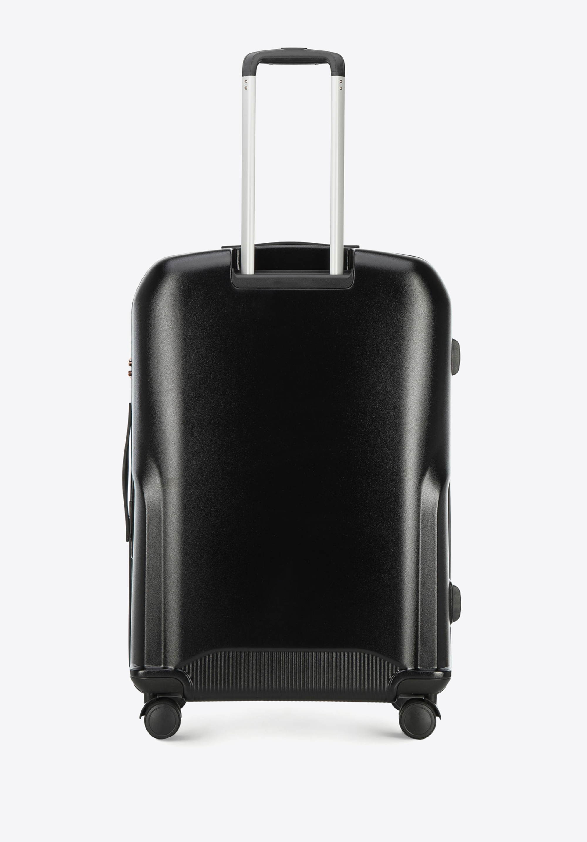 - Material: Policarbonatul utilizat atât pentru valiză, cât și pentru geanta cosmetică asigură durabilitate, rezistență la impact și manevrabilitate ușoară.