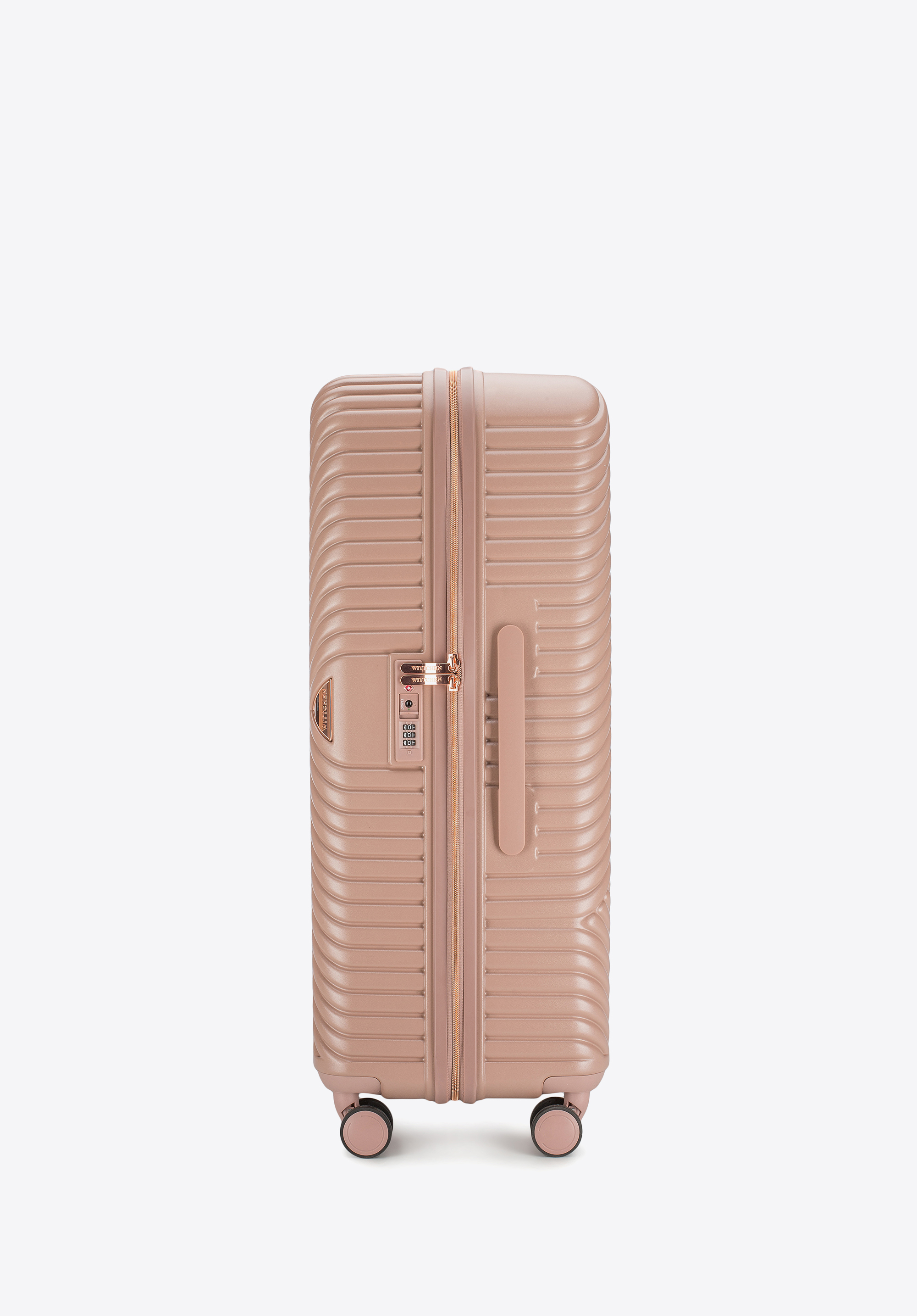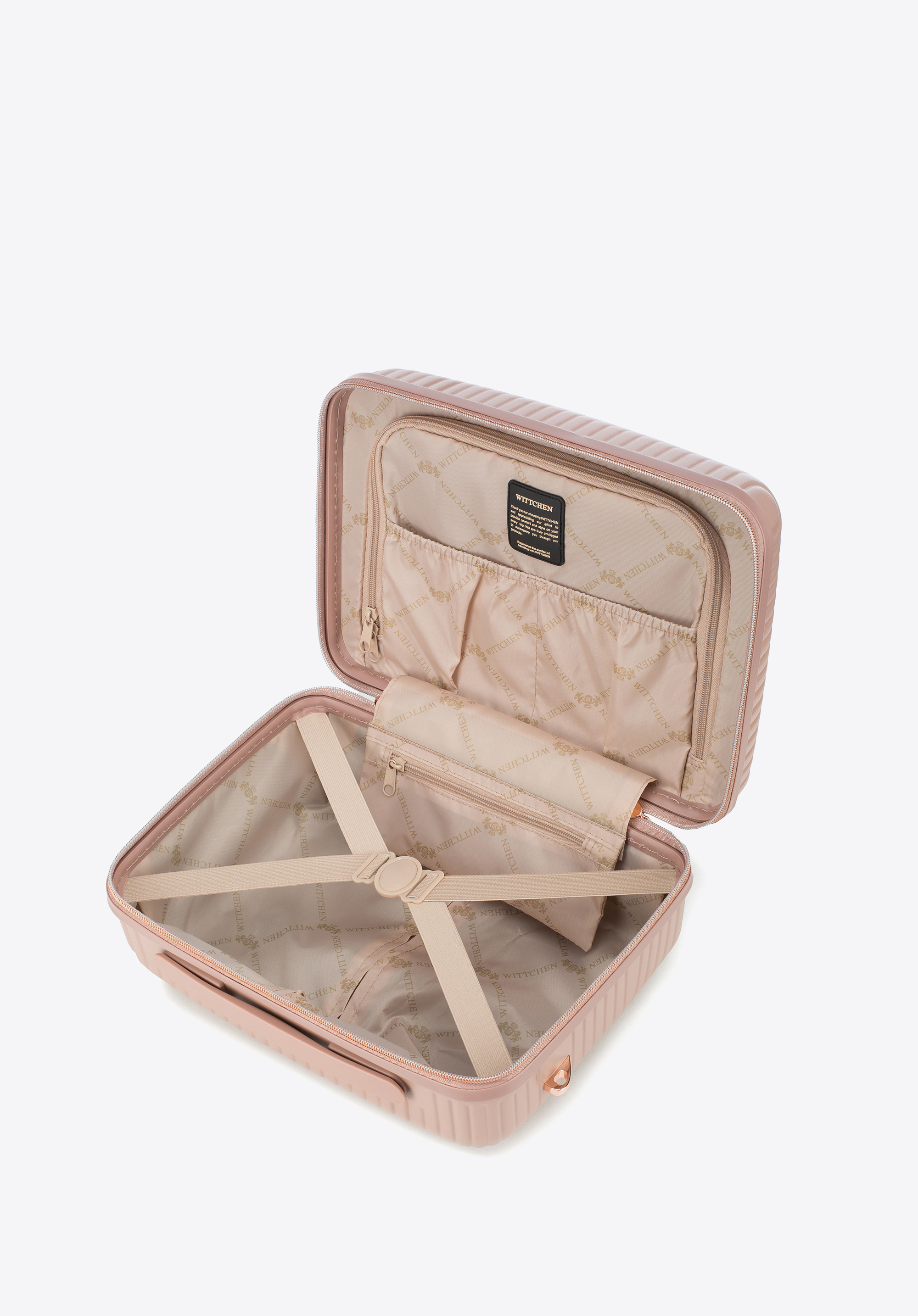 - Interior valizei: Compartiment principal cu curele de fixare; compartiment cu fermoar; două buzunare din plasă și un buzunar suplimentar cu fermoar – toate finisate cu o căptușeală bej cu sigla WITTCHEN.
