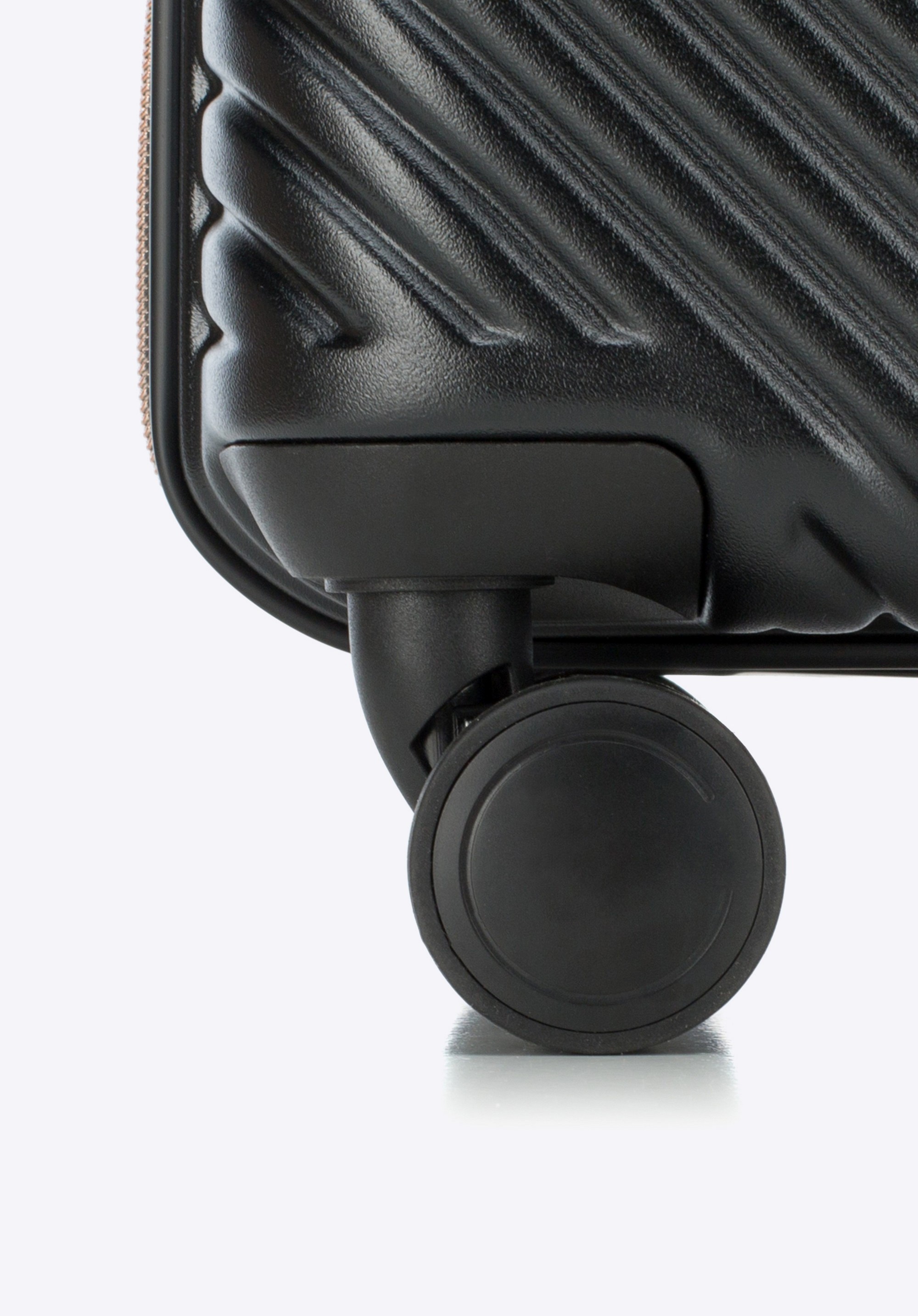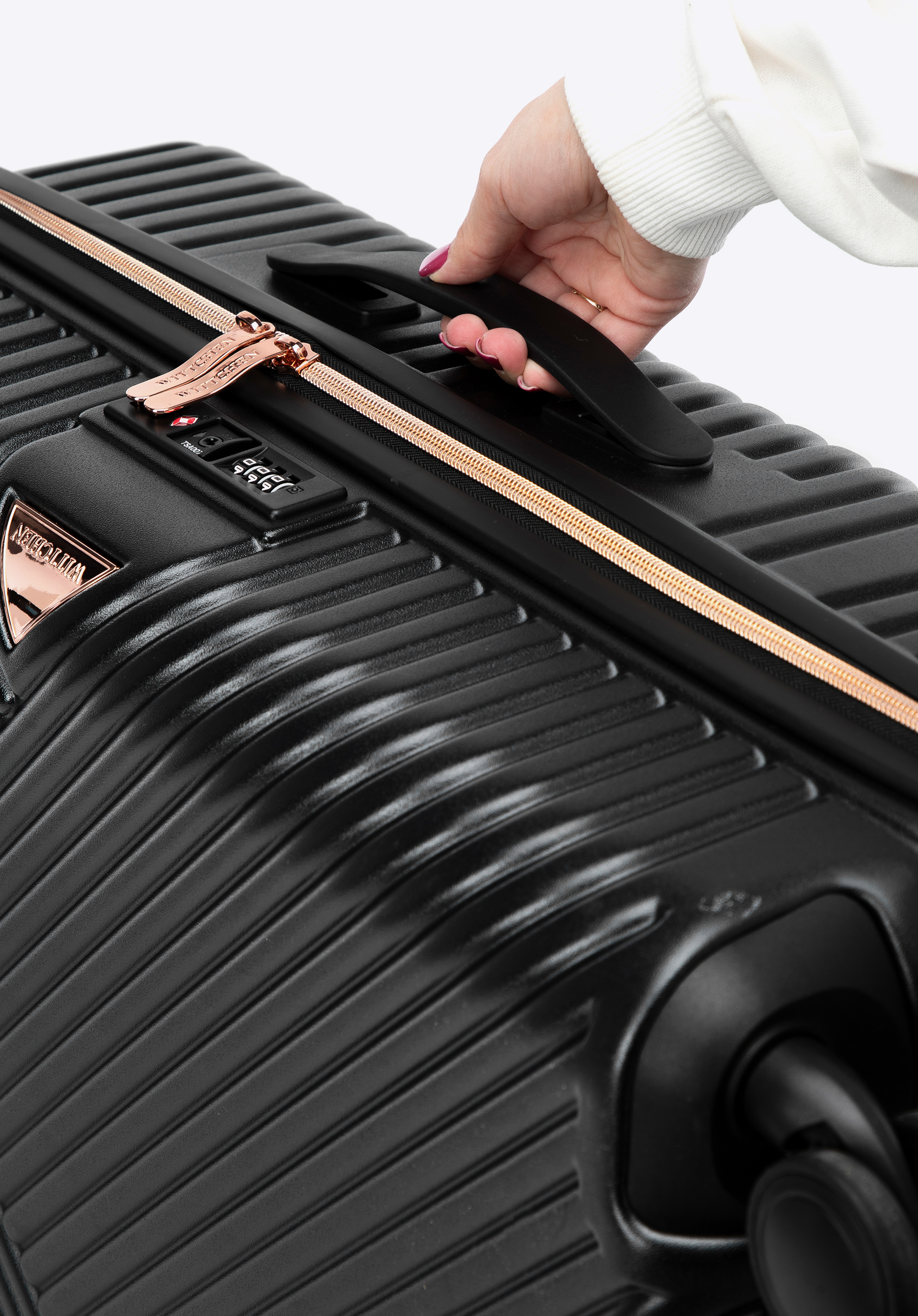 Un troler de mărime medie realizat din policarbonat cu un finisaj mat.Este un proiect de design cu accesorii strălucitoare în aur roz.Roțile sunt realizate s din plastic ABS cu acoperire flexibilă.Interiorul trolerului este acoperit cu căptușeală bej cu sigla WITTCHEN.Modelul este disponibil în trei nuanțe: alb , ; negru și roz .