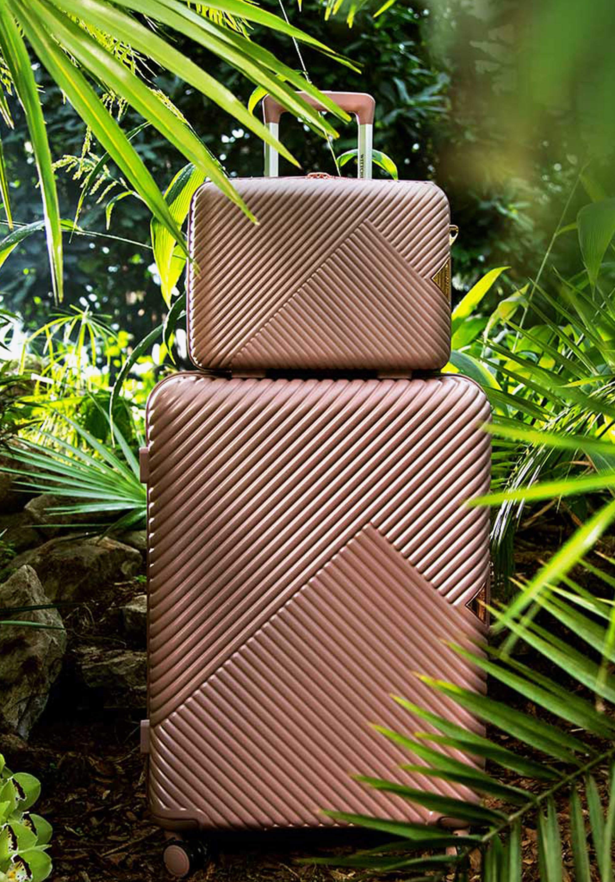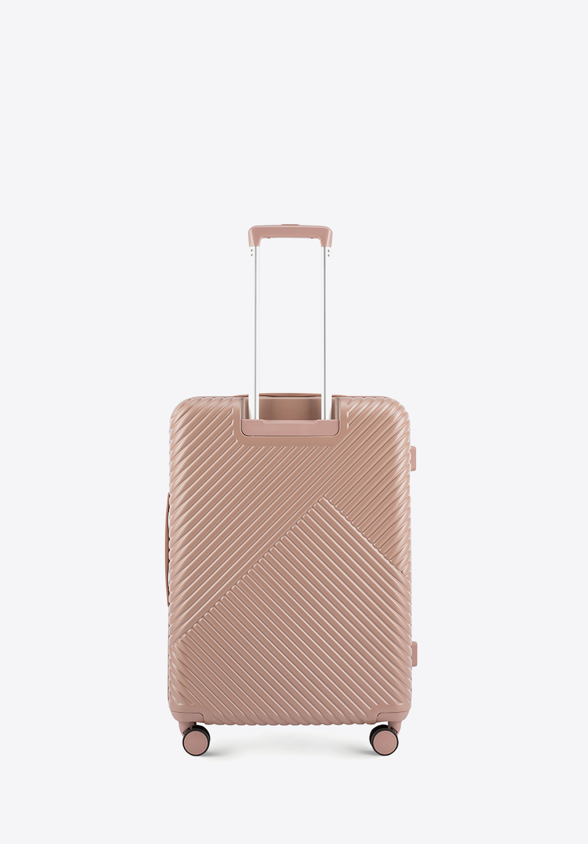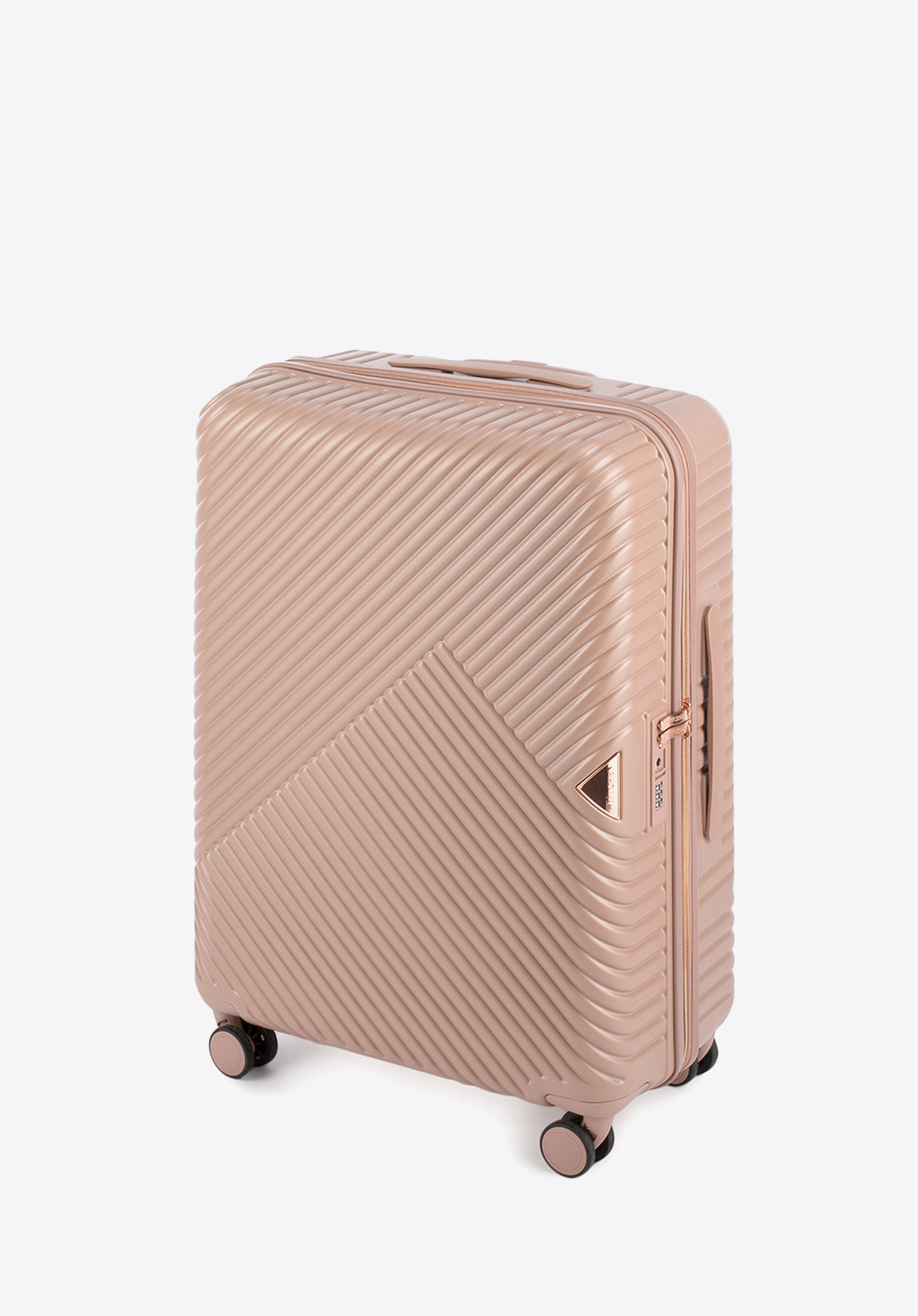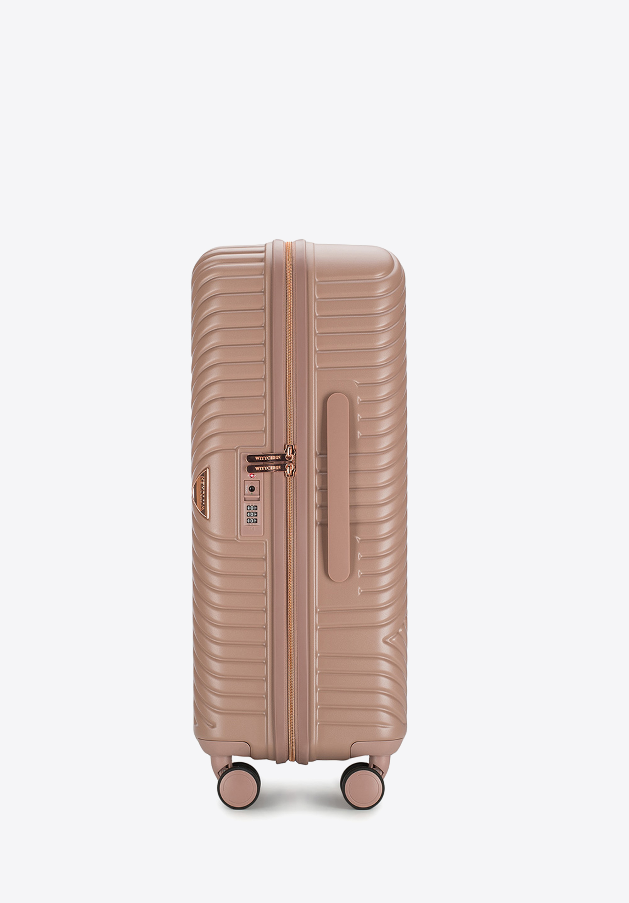 Un troler de mărime medie realizat din policarbonat cu un finisaj mat.Este un proiect de design cu accesorii strălucitoare în aur roz.Roțile sunt realizate s din plastic ABS cu acoperire flexibilă.Interiorul trolerului este acoperit cu căptușeală bej cu sigla WITTCHEN.Modelul este disponibil în trei nuanțe: alb , ; negru și roz .