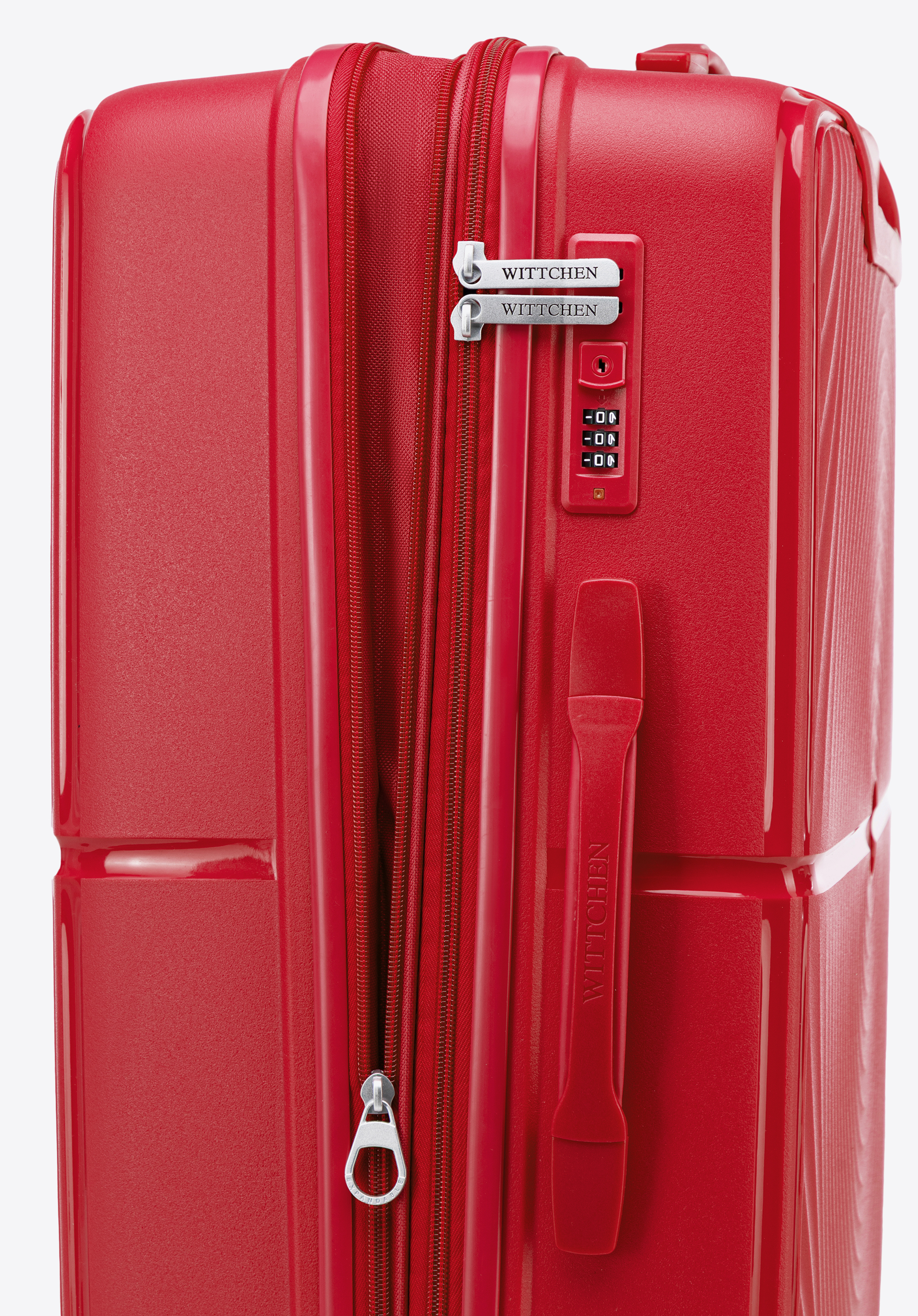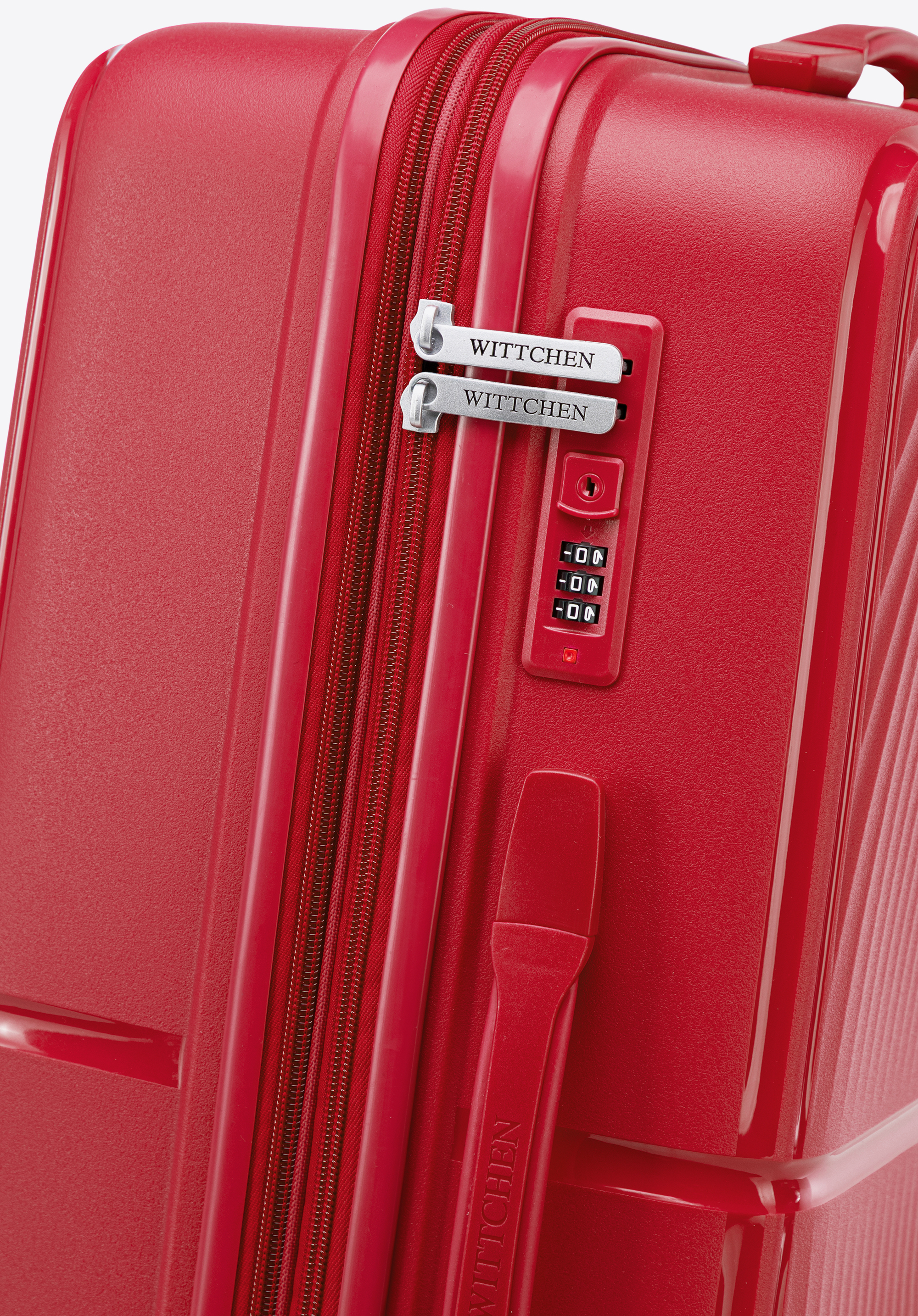 - Stabilitate: Patru știfturi laterale permit valizei să se sprijine în siguranță pe o parte.