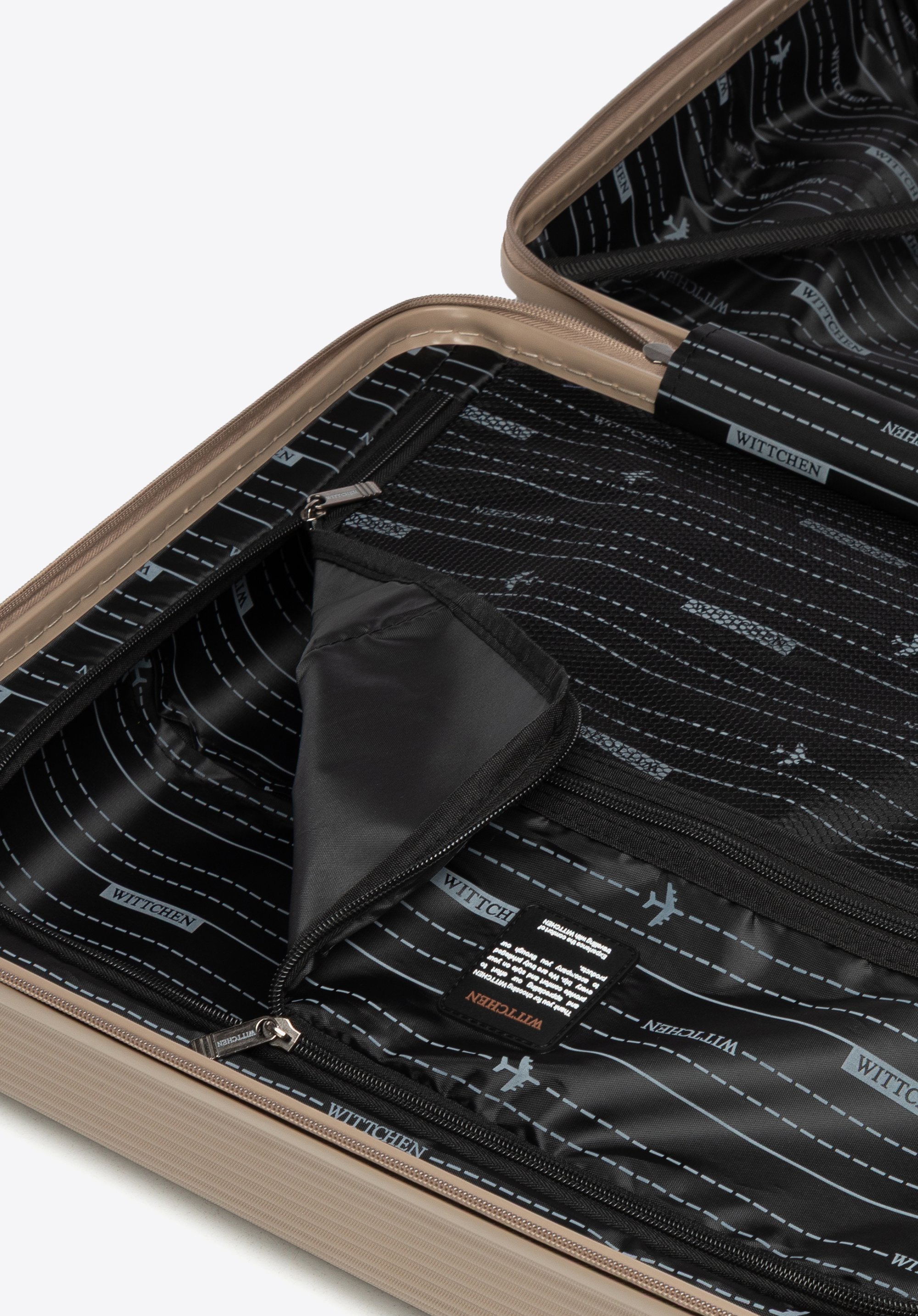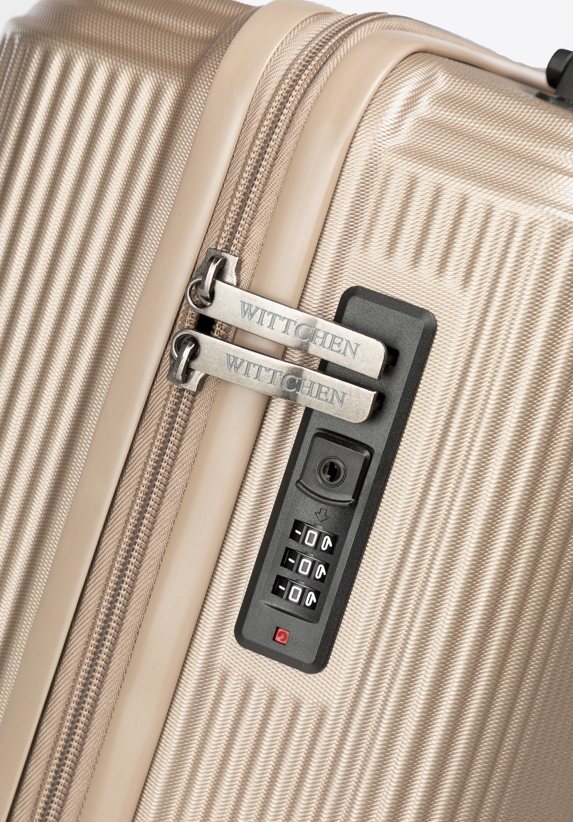 - Design : Imprimarea verticală contemporană în relief pe carcasă și detaliile negre conferă valizei un aspect elegant și atemporal.