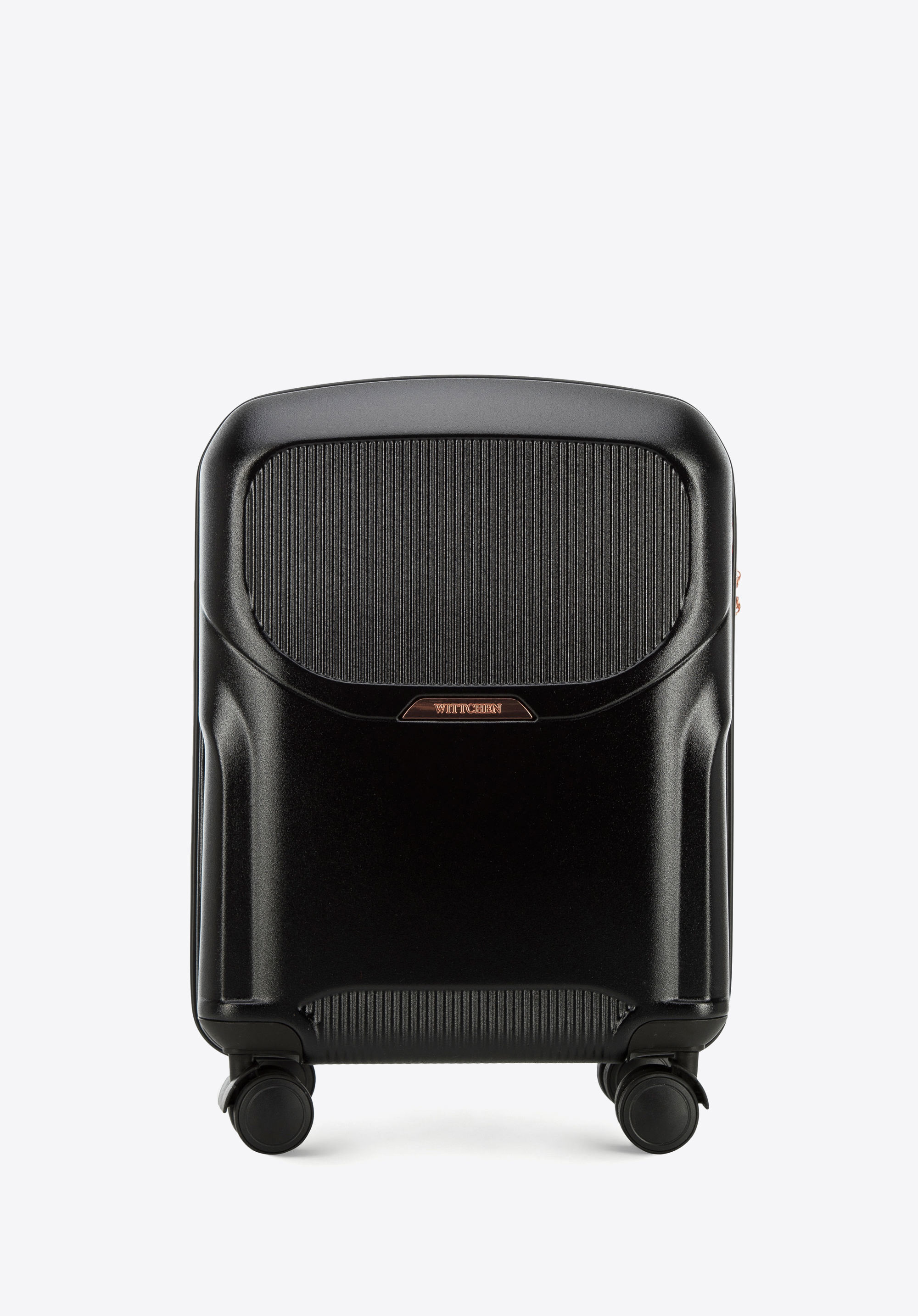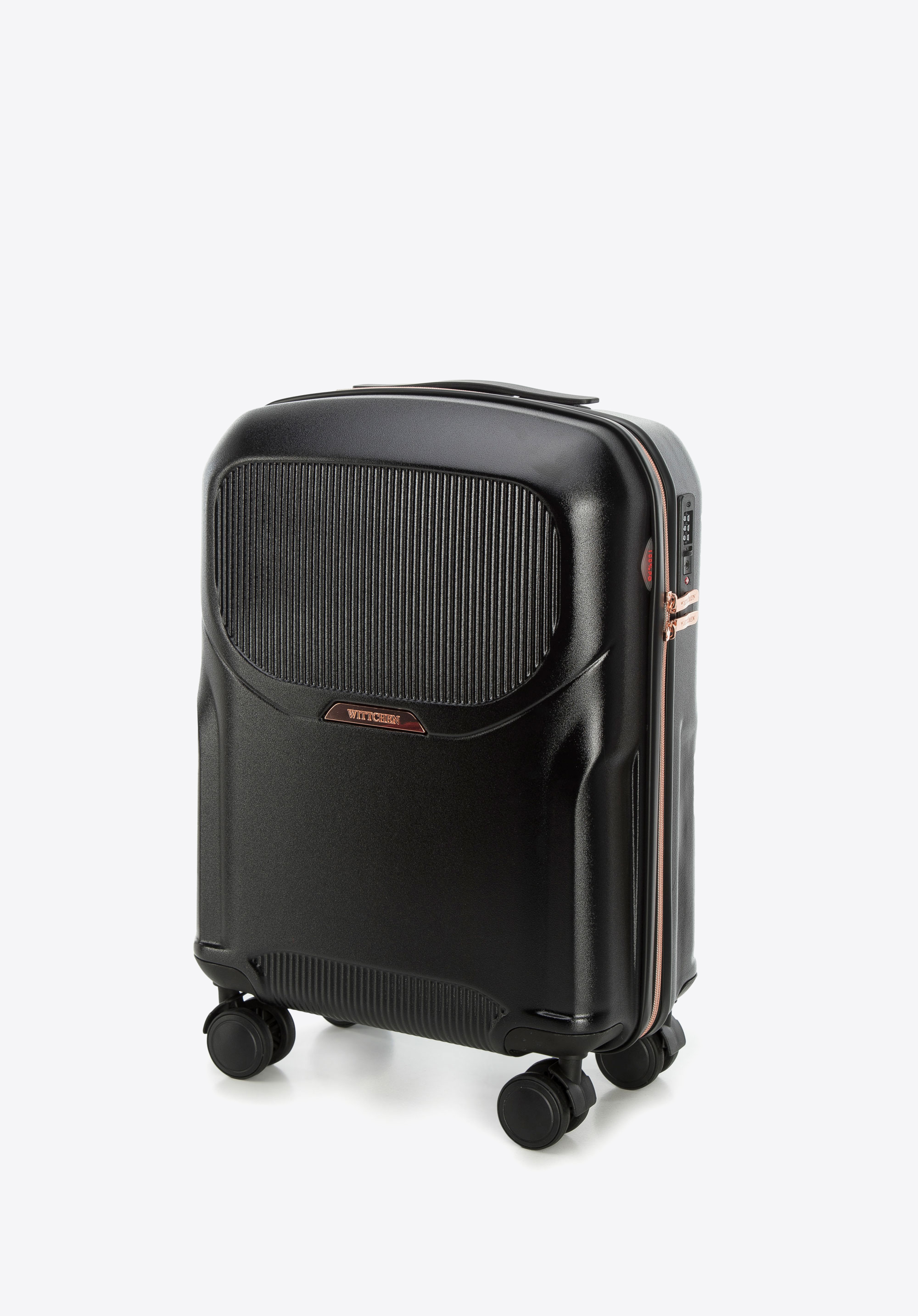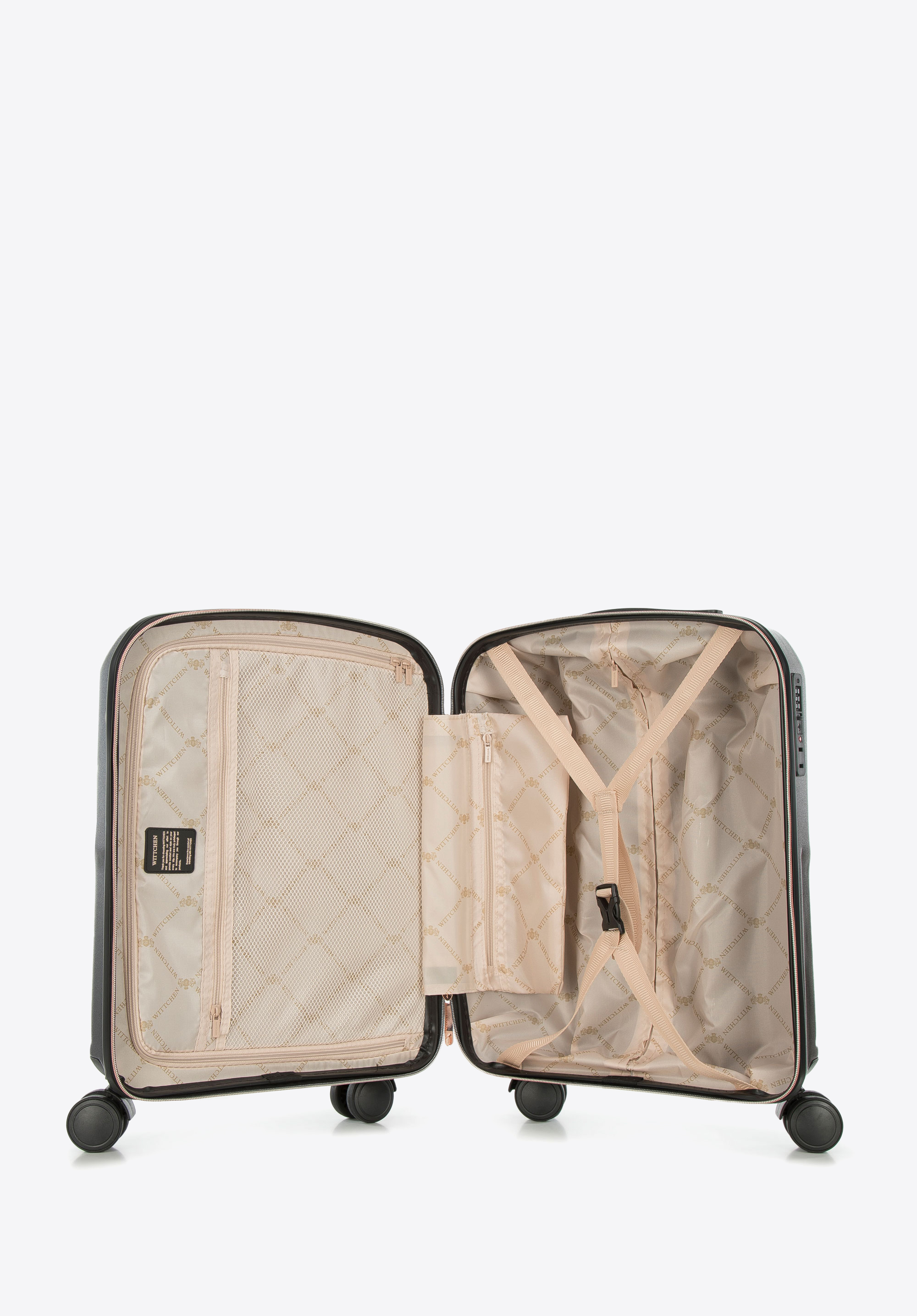 design elegant cu caneluri, completat de inserții roz-aurite.Veți lua această valiză mică la bordul majorității companiilor aeriene.În interior, este